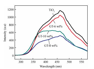 Abstract: In this paper an improvement in the photocatalytic performance of TiO2 was carried out via hybridizing with graphene. Graphene-TiO2 (GR-TiO2)nanocomposites with different weight addition ratios of graphene oxide (GO) have been prepared via a facile microwave irradiation of GO and tetrabutyl titanate in isopropyl alcohol. Raman spectroscopy (RS), X-ray diffraction (XRD), scanning electron microscopy (SEM), transmission electron microscopy (TEM), UV-visible spectroscopy (UV-vis), Fourier transform infrared spectra (FTIR), energy dispersive X-ray spectroscopy (EDX) and photoluminescence spectra (PL) are employed to determine the properties of the samples. Microwave irradiation can heat the reactant to a higher temperature in a short time, simultaneously GO is reduced to graphene and TiO2 nanoparticles grown on the surface of GR. GR-TiO2 nanocomposites synthesized via this approach have efficient electron conductivity in GR, resulting in a reduced electron-hole recombination rate. Among the synthesized nanocomposites, GT-8wt% exhibited the best photocatalytic activity toward photocatalytic degradation of MB. Our current work provides a new insight for the fabrication of GR-TiO2 nanocomposites within a short reaction time and also explains the mechanism of photocatalysis employing radical and hole scavengers.