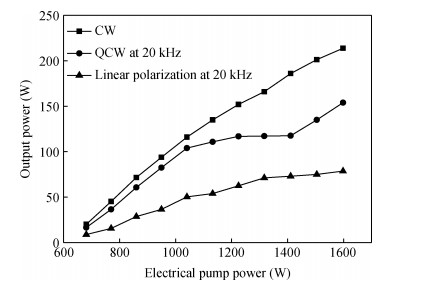 Abstract: A simple and compact linear resonator green laser at 532 nm is generated by intracavity frequencydoubling of a diode-side-pumped acousto-optically (AO) Q-switched Nd:YAG laser at 1064 nm. Two acoustooptic Q-switches were placed orthogonally with each other to improve the hold-off capacity. As high as 214 W of continuous-wave (CW) and 154 W of quasi-continuous-wave (QCW) output power at 1064 nm were obtained when the pumping power was 1598 W. The type Ⅰ phase-matched BBO crystal was used as the nonlinear medium in the second harmonic generation. A green laser with an average output power of 37 W was obtained at a repetition rate of 20 kHz and a pulse width of 54 ns, which corresponds to pulse energy of 1.85 mJ per pulse and a peak power 34.26 kW, respectively.