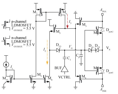 Abstract: For stacked battery monitoring IC high speed and high precision voltage acquisition requirements, this paper introduces a kind of symmetrical type high voltage switch circuit. This kind of switch circuit uses the voltage following structure, which eliminates the leakage path of input signals. At the same time, this circuit adopts a high speed charge pump structure, in any case the input signal voltage is higher than the supply voltage, it can fast and accurately turn on high voltage MOS devices, and convert the battery voltage to an analog to digital converter. The proposed high voltage full symmetry switch has been implemented in a 0.18μm BCD process; simulated and measured results show that the proposed switch can always work properly regardless of the polarity of the voltage difference between the input signal ports and an input signal higher than the power supply.