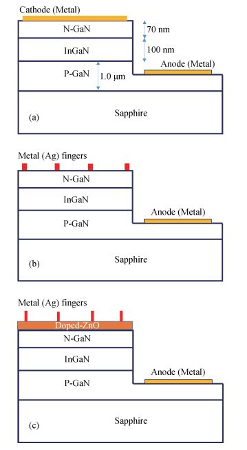 Fig. 1.  (a), (b), (c) Schematic of GaN/InGaN solar cell with metal (Ag) film and metal fingers electrode and metal (Ag)-fingers/doped-ZnO electrodes respectively.