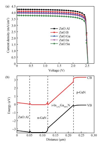 Fig. 2.  (a) J-V curve of solar cell with Ag-finger/ZnO thin film electrode with different dopants. (b) Energy band diagram of solar cell with ZnO:Al layer.