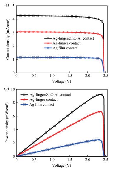 Fig. 3.  (a) J-V curve and (b) power curve w.r.t voltage of solar cells with different electrodes.