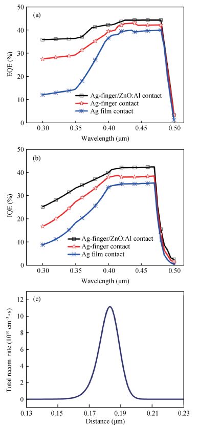 Fig. 5.  (a) EQE and (b) IQE curve of solar cells with ZnO and metal electrodes. (c) Recombination rate inside i-InGaN layer of solar cell under zero bias.