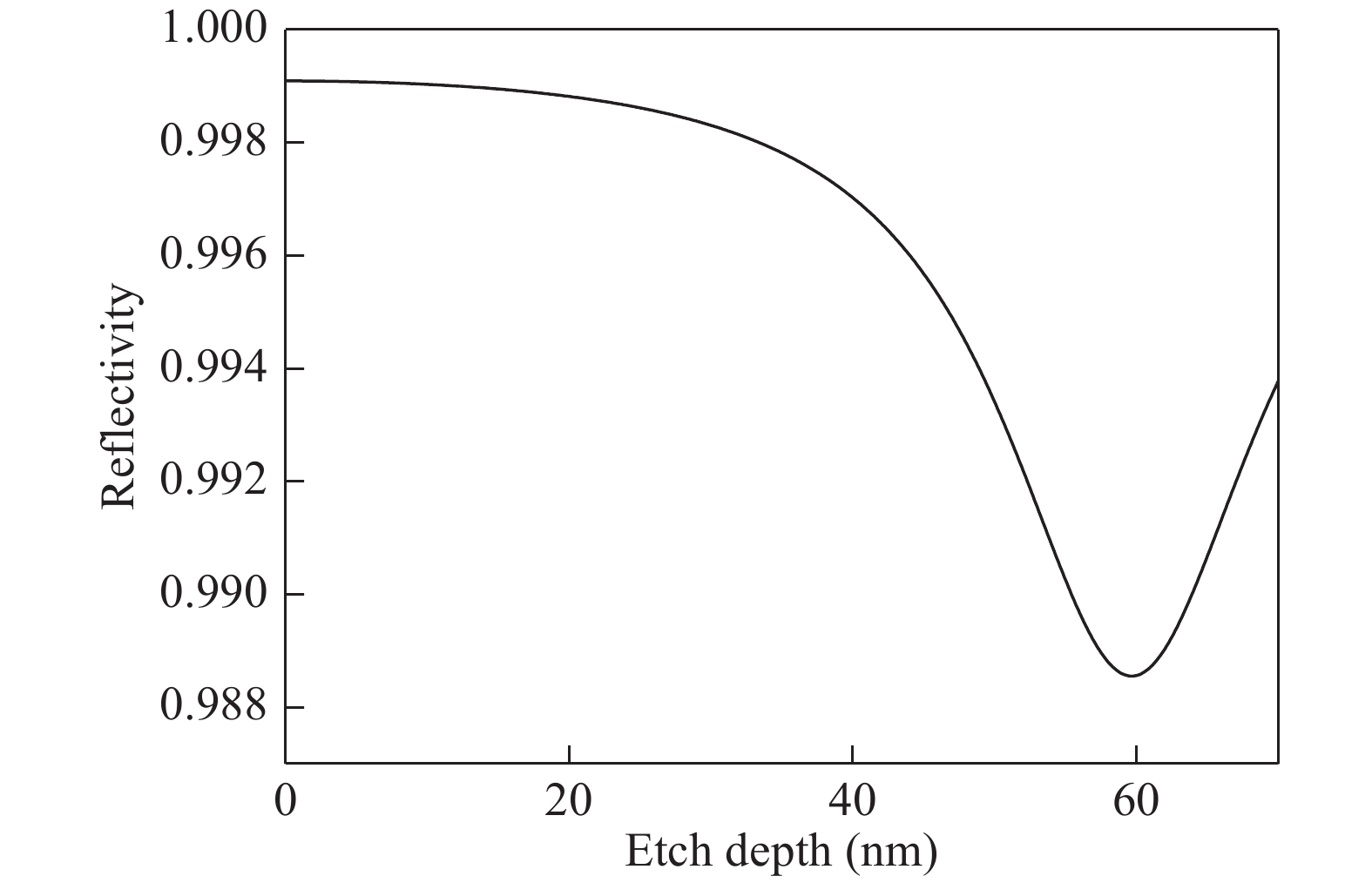 Fig. 2.  Calculated top DBR reflectivity as a function of etch depth into the top DBR.