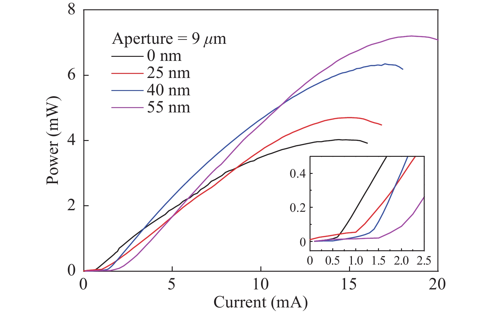 Fig. 3.  (Color?online) Output power versus current for the 9 μm oxide-aperture VCSELs with different etch depth. Inset: close-up of the threshold region.