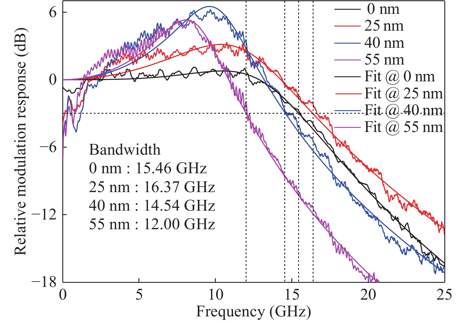 Fig. 4.  (Color?online) Small signal modulation bandwidth of the 9 μm oxide-aperture VCSEL with different etch depths at room temperature.