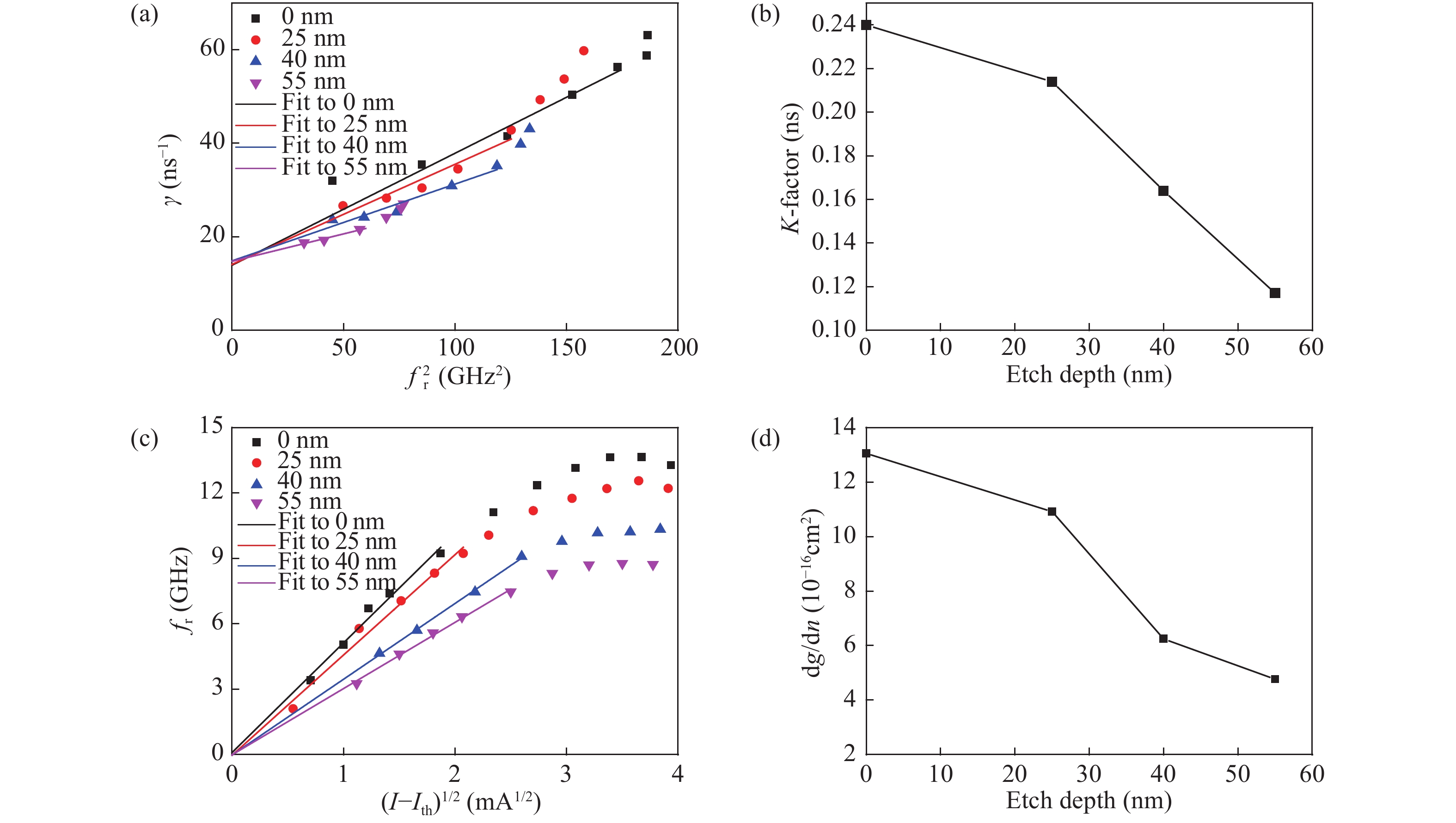 Fig. 5.  (Color?online) (a) Damping rate versus resonance frequency squared. (b) K-factor values for 9 μm oxide-aperture VCSELs with different etch depth. (c) Resonance frequency versus square root of bias current density above the threshold for the 9-μm oxide aperture VCSELs with different etch depths. Fits for extracting the D-factor are indicated. (d) Differential gain versus etch depth for the 9-μm aperture VCSEL calculated from the D-factor.