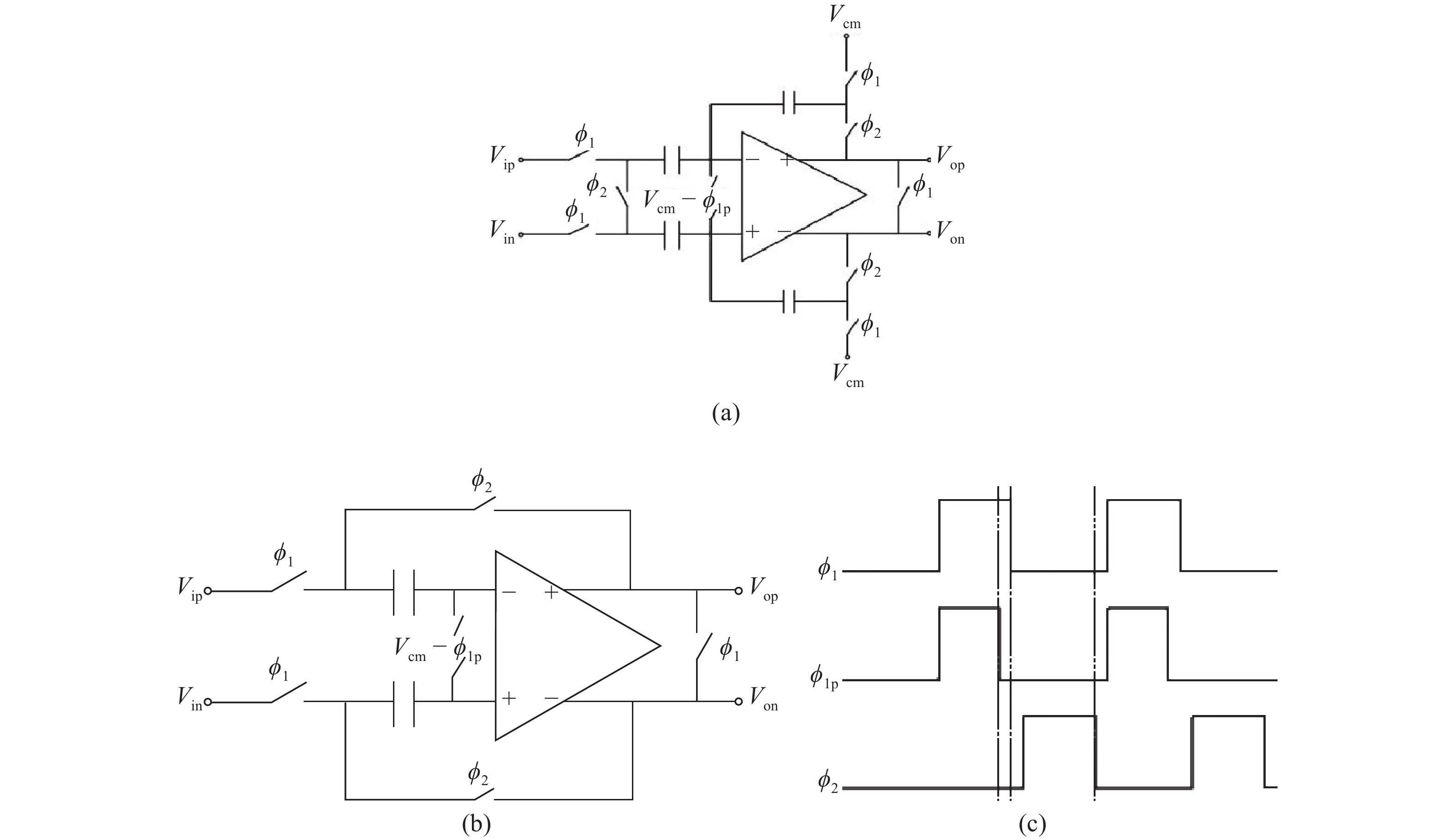 Fig. 1.  (a) Charge redistribution S/H circuit. (b) Capacitor flip-around S/H circuit. (c) Timing diagram.