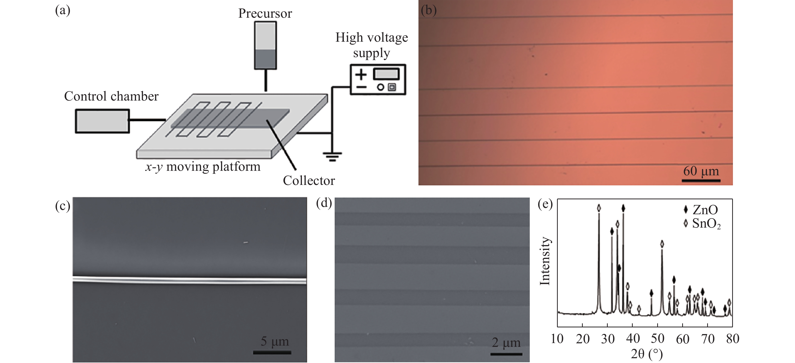 Abstract: A ZnO–SnO2 nanowires (NWs) array, as a metal oxide semiconductor, was successfully synthesized by a near-field electrospinning method for the applications as high performance ultraviolet photodetectors. Ultraviolet photodetectors based on a single nanowire exhibited excellent photoresponse properties to 300 nm ultraviolet light illumination including ultrahigh Ion/Ioff ratios (up to 103), good stability and reproducibility because of the separation between photo-generated electron-hole pairs. Moreover, the NWs array shows an enhanced photosensing performance. Flexible photodetectors on the PI substrates with similar tendency properties were also fabricated. In addition, under various bending curvatures and cycles, the as-fabricated flexible photodetectors revealed mechanical flexibility and good stable electrical properties, showing that they have the potential for applications in future flexible photoelectron devices.