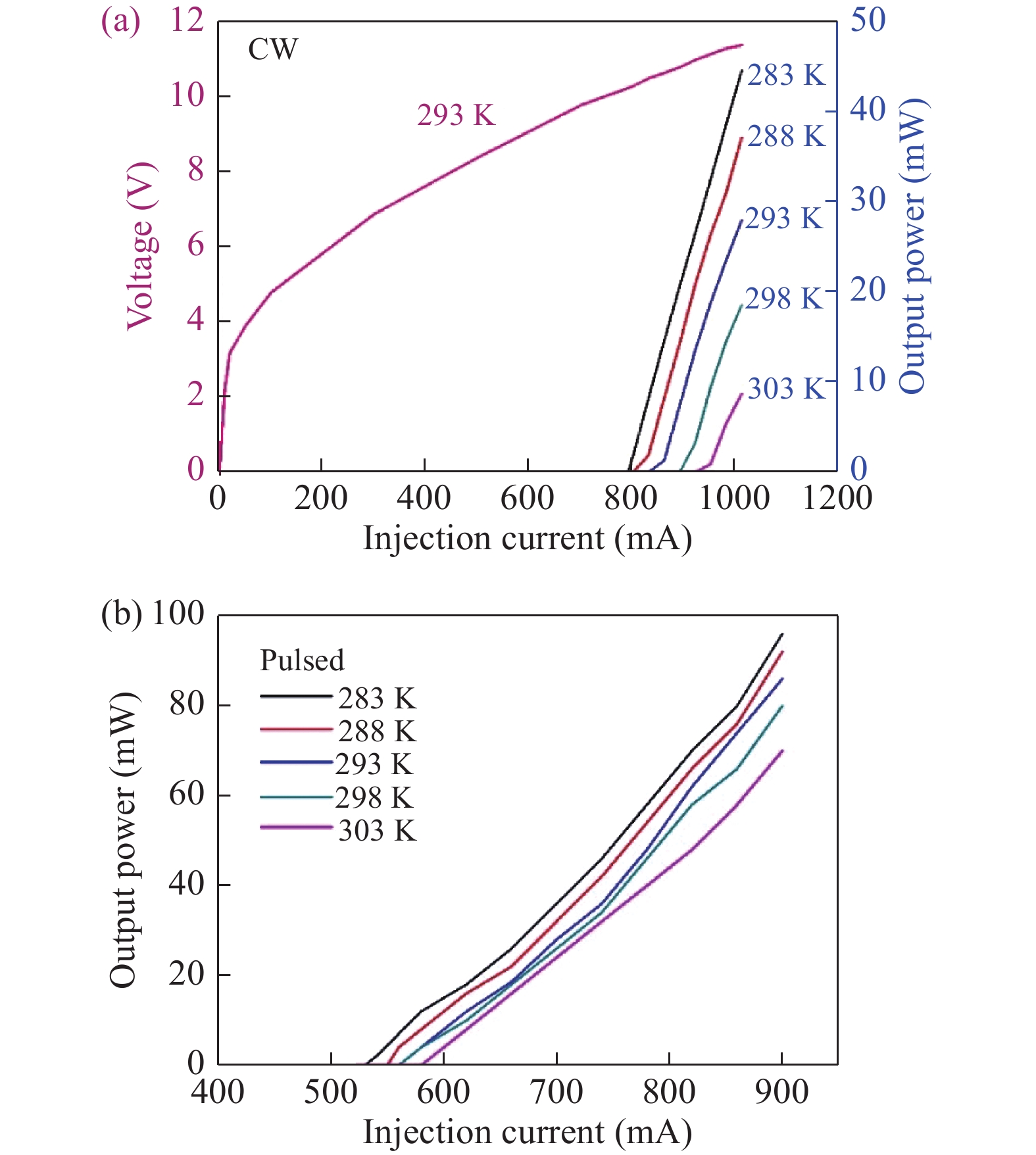 Abstract: Continuous wave (CW) operation of long wave infrared (LWIR) quantum cascade lasers (QCLs) is achieved up to a temperature of 303 K. For room temperature CW operation, the wafer with 35 stages was processed into buried heterostructure lasers. For a 2-mm-long and 10-μm-wide laser with high-reflectivity (HR) coating on the rear facet, CW output power of 45 mW at 283 K and 9 mW at 303 K is obtained. The lasing wavelength is around 9.4 μm locating in the LWIR spectrum range.