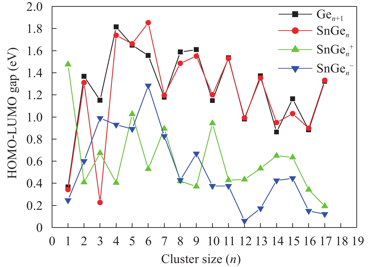 Table 4. Average bond length aGe-Ge and aSn-Ge for neutral, cationic and anionic SnGen(0 ± 1) (n = 1–17) clusters.
