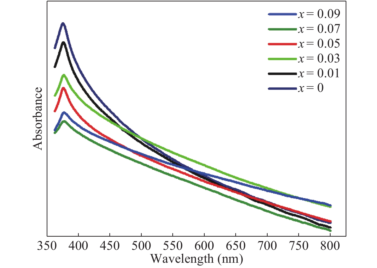| Doping concentration (x) | Absorbance peak (nm) | Band gap (eV) | Grain size (nm) | Magnetization (emu/g) |