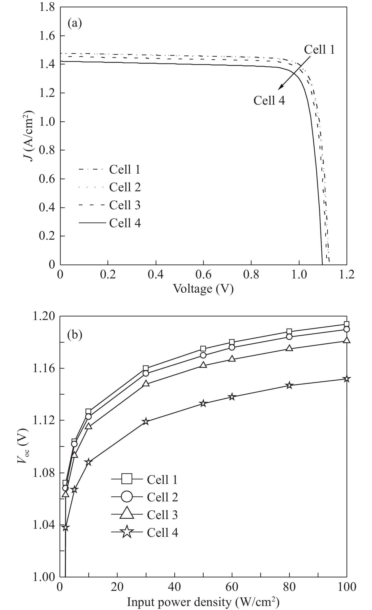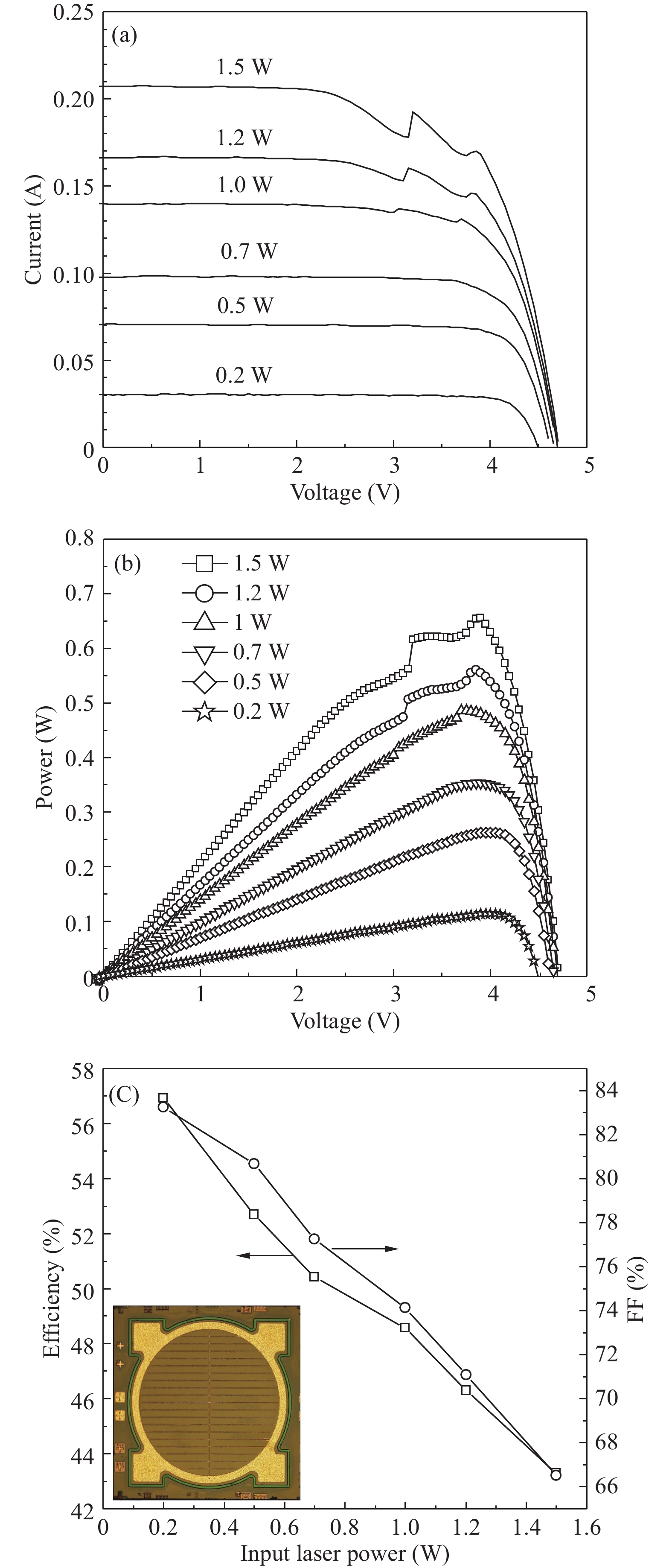 Abstract: Four-junction AlGaAs/GaAs laser power converters (LPCs) with n+-GaAs/p+-Al0.37Ga0.63As heterostructure tunnel junctions (TJs) have been designed and grown by metal-organic chemical vapor deposition (MOCVD) for converting the power of 808 nm lasers. A maximum conversion efficiency ηc of 56.9% ± 4% is obtained for cells with an aperture of 3.14 mm2 at an input laser power of 0.2 W, while dropping to 43.3% at 1.5 W. Measured current–voltage (I–V) characteristics indicate that the performance of the LPC can be further improved by increasing the tunneling current density of TJs and optimizing the thicknesses of sub-cells to achieve current matching in LPC.