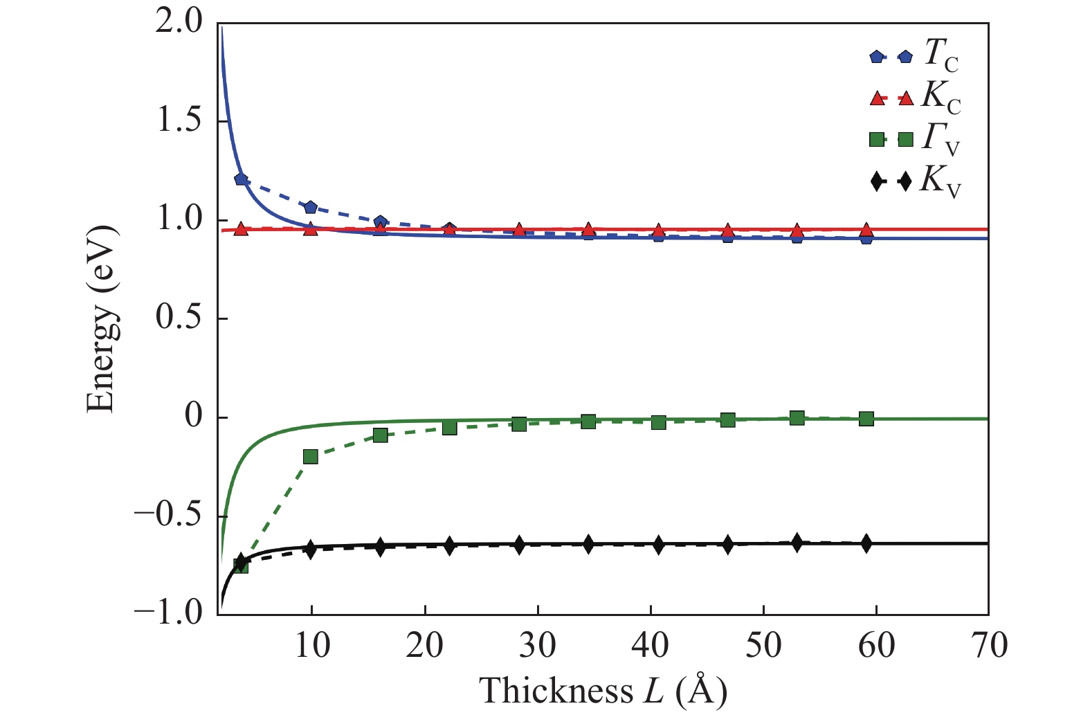 Fig. 3.  (Color online) Evolution of calculated band energies of the band-edge states determining the indirect to direct band-gap transition with the thickness L for MoS2. The solid lines represent the fitting results based on the finite potential-well model (i.e., the equation mentioned above with n = 1). The dash lines are drawn as a guide to the eye.