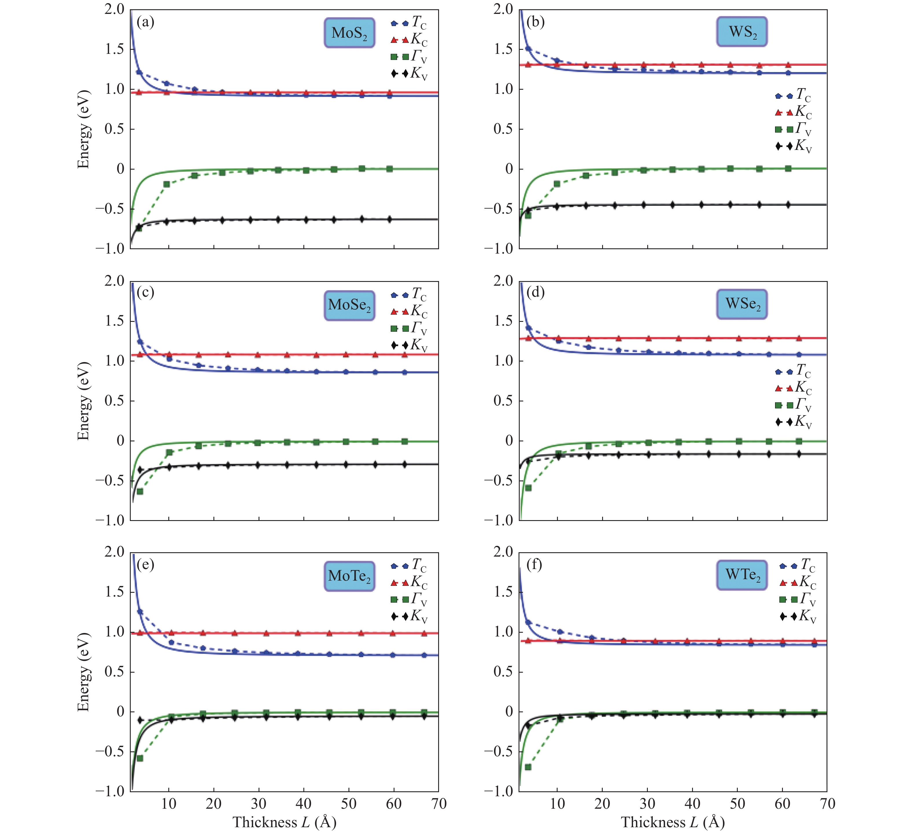 Fig. 4.  (Color online) Evolution of band energies of the relevant band-edge states with the thickness L for all the investigated group-VIB TMDs MX2 (M = Mo, W and X = S, Se, Te). Similar to Fig. 3, the solid lines represent the fitting results based on the finite potential-well model and the dash lines are drawn as a guide to the eye.