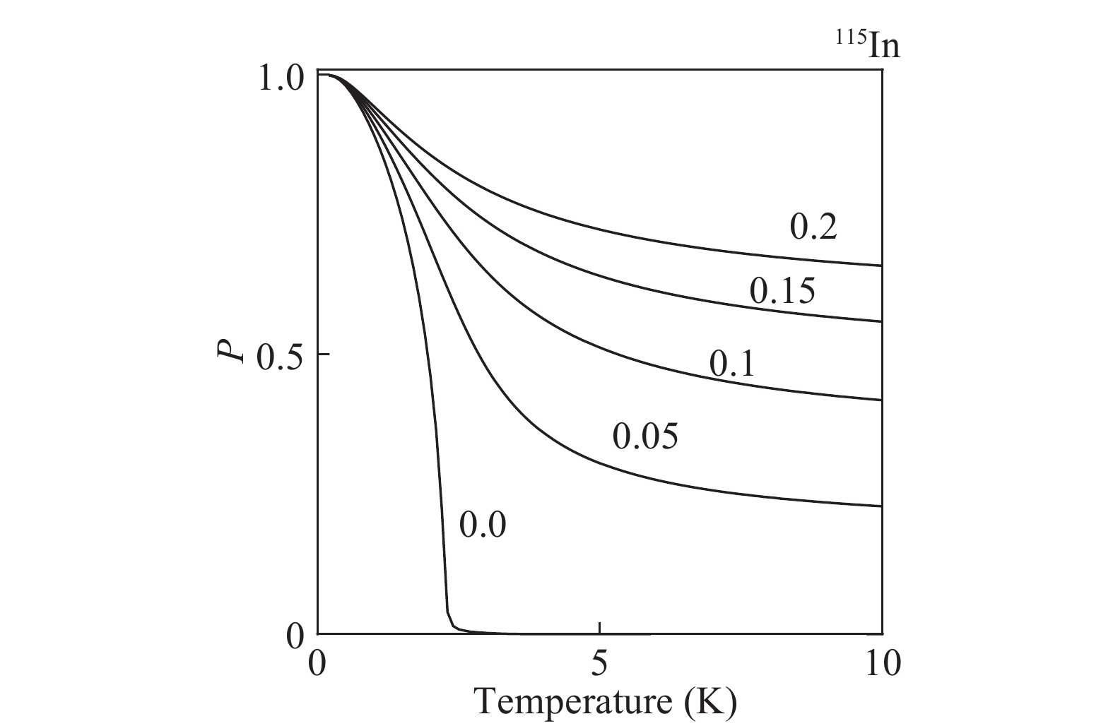 Abstract: III–V semiconductors exhibit dynamic nuclear self-polarization (DYNASP) owing to the contact hyperfine interaction (HFI) between optically excited conduction electrons and lattice nuclei. In the self-polarization process at a low temperature, electron spin state and the nuclear polarization (magnetization) exchange a positive feedback, increasing energy splitting of the conduction electron states, thereby a large nuclear polarization. This phenomenon was theoretically predicted previously for conduction electrons excited linearly and elliptically polarized light. The polarization of the conduction electrons was represented by a parameterα in a formula for nuclear polarization (Eq. (9) in Ref. [1]); however, the effect of external magnetic fields on the nuclear polarization was not considered. Therefore, this study introduces this effect by further extending the previous studies. Herein, α′ represents the combination of the effects of elliptically polarized electrons and an external magnetic field, which is used in the equations presented in previous studies. When α′ = 0, a large nuclear polarization is obtained below critical temperature Tc, but no polarization occurs above Tc. When α′ > 0, the nuclear polarization is enhanced above Tc. Below Tc, the nuclear polarization follows a hysteresis curve when α′ is partially manipulated by adjusting the degree of the polarization of the exciting laser.
