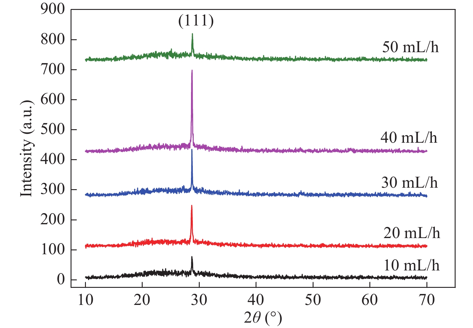 | Solution flow rate (mL/h) | (hkl) | 2θ (degree) | FWHM (degree) | D (nm) | δ (1014 lines/m2) | ε (10?4) |