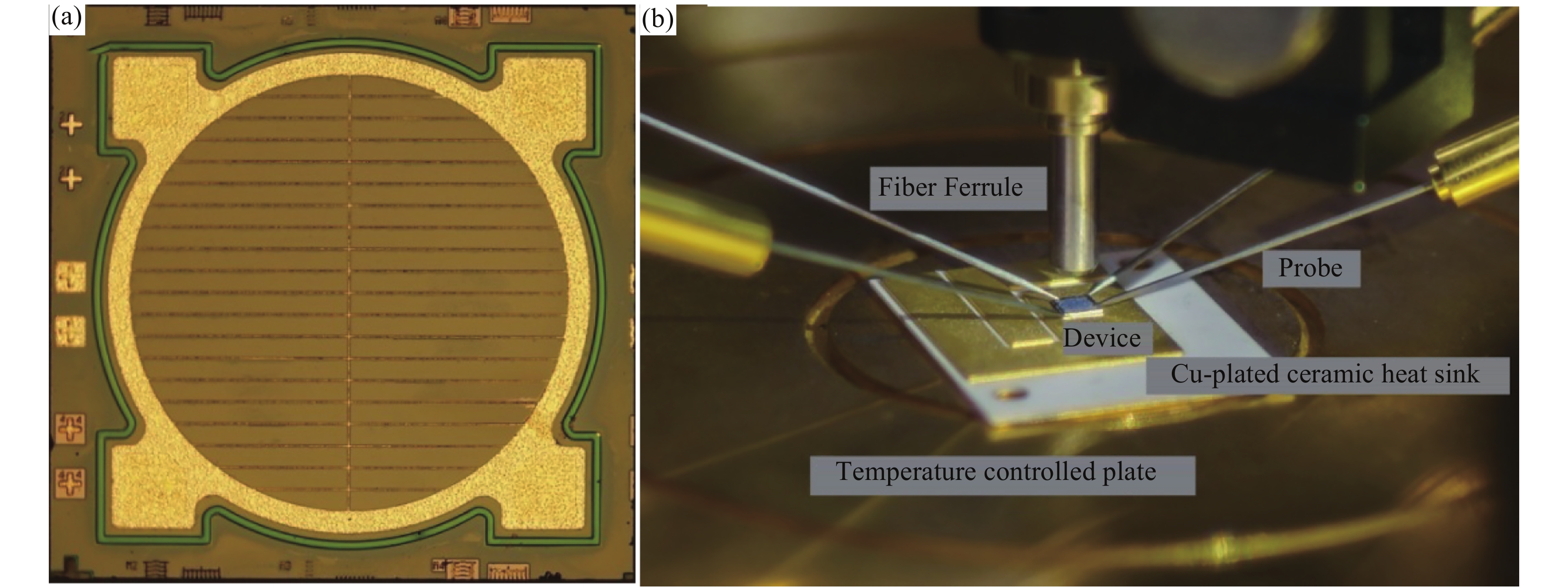 Fig. 4.  (Color online) (a) A microscopic image of a six-junction GaAs LPC, and (b) a picture of the measurement setup.