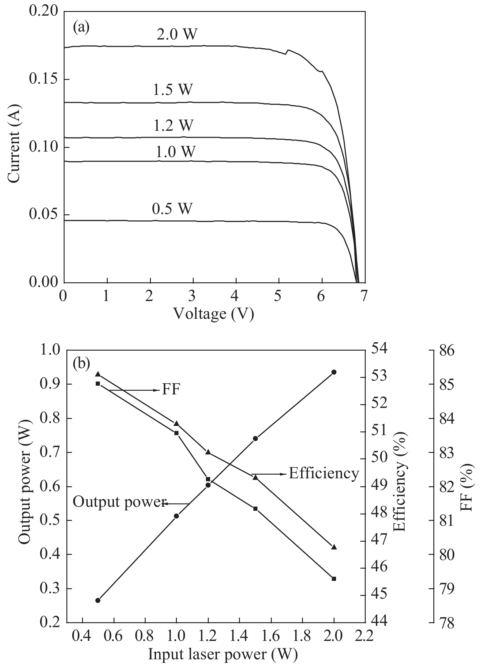 Fig. 6.  (a) Measured IV characteristics. (b) Output power, ηc and FF as a function of input laser power.