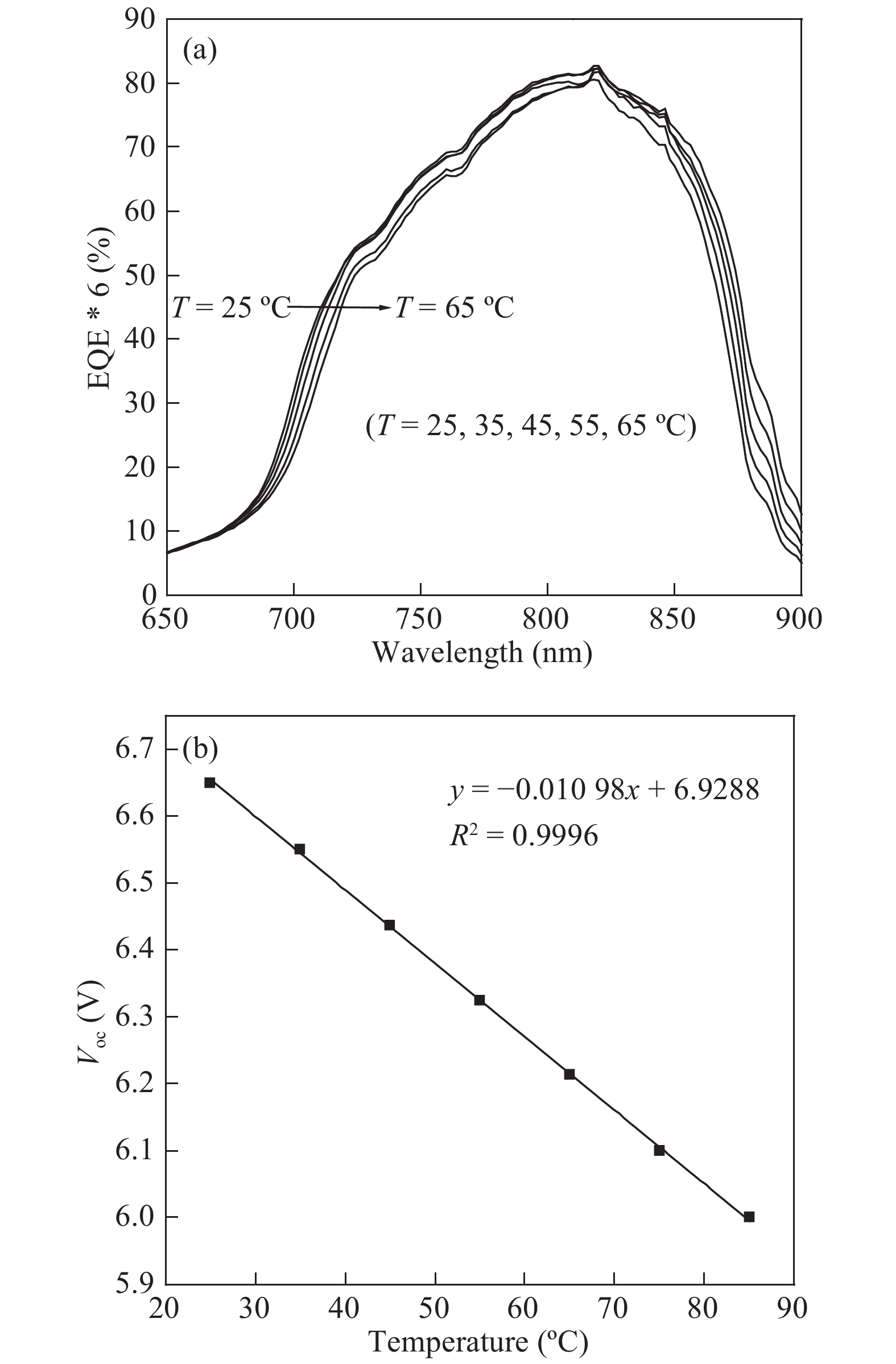 Fig. 7.  The dependence of measured results on temperature: (a) EQE, and (b) Voc.