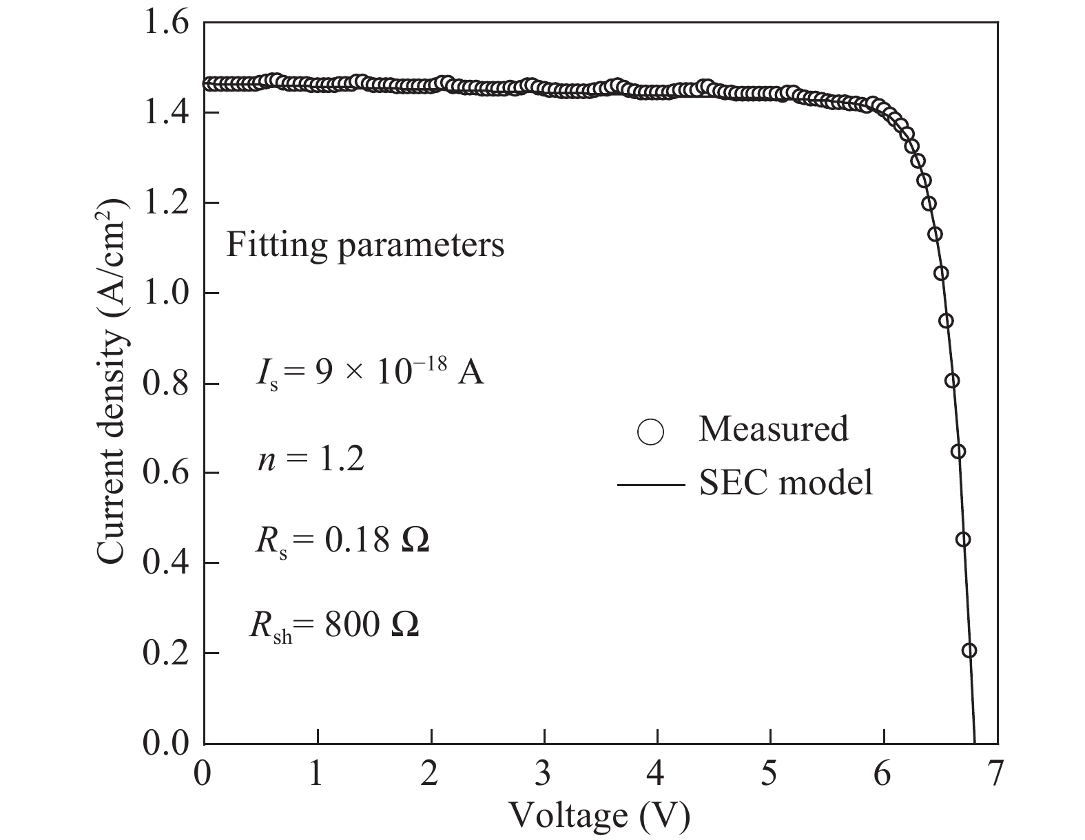 Fig. 8.  Measured (circles) and fitting IV characteristics of an LPC using the SEC model (solid line).