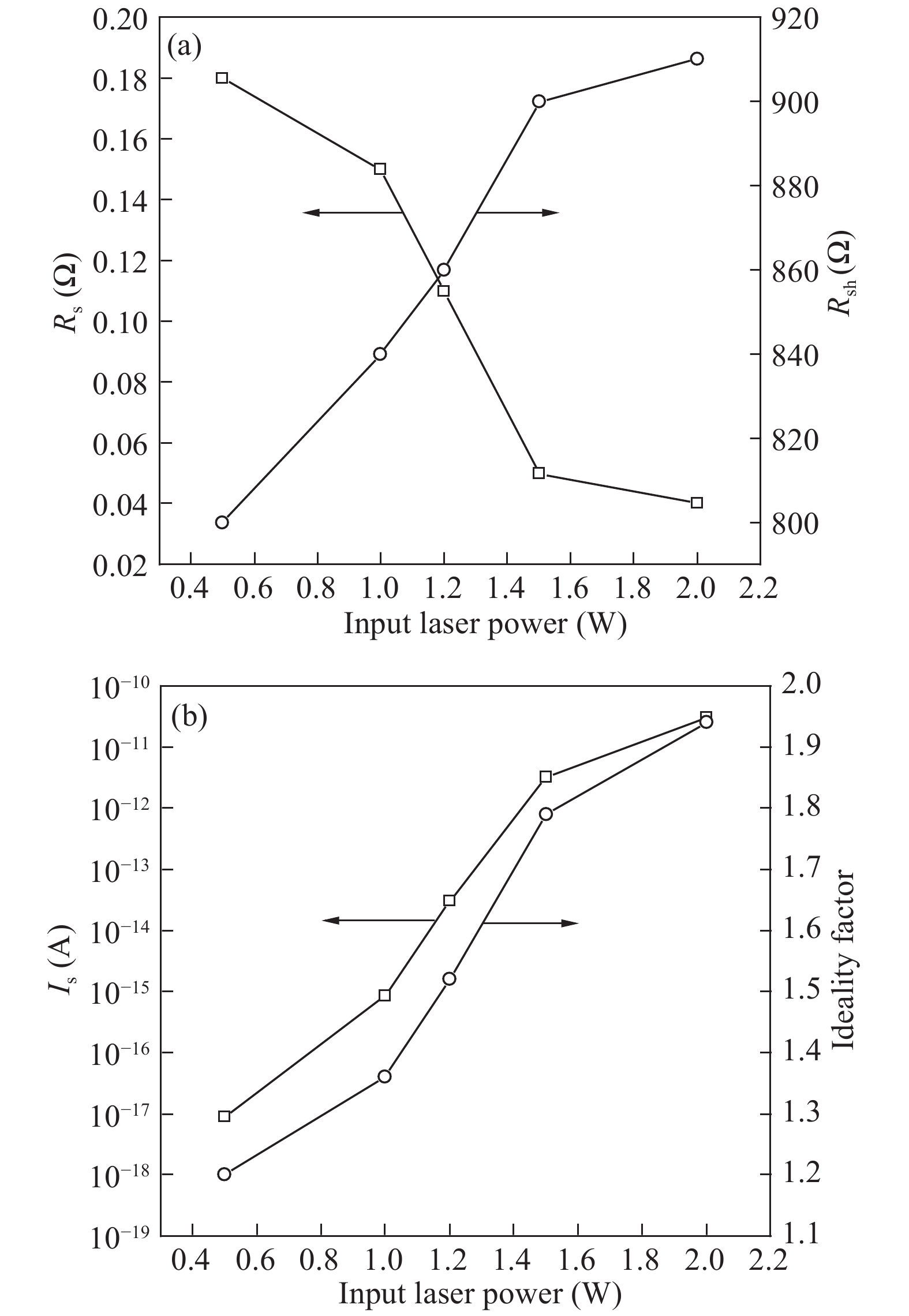 Fig. 9.  Dependence of the parameters of sub-cell on input laser power: (a) Rs and Rsh, and (b) Is and n.