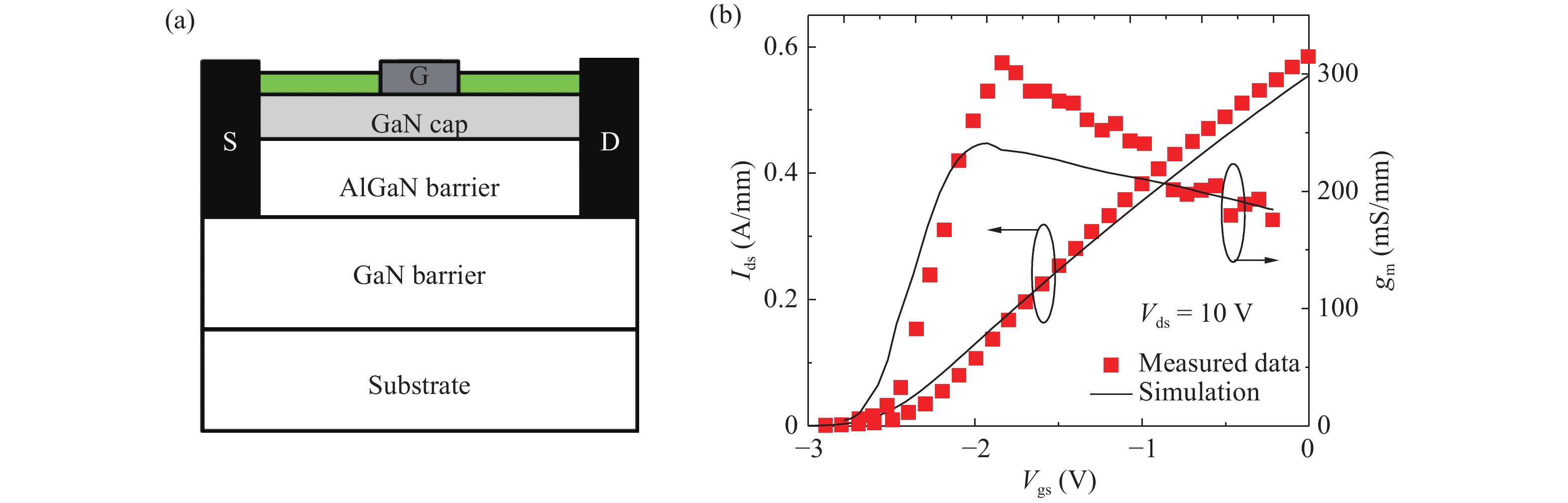 Fig. 1.  (Color online) Calibration of the simulation model: (a) schematic cross-section structure of the device, (b) comparison results with the measured data.