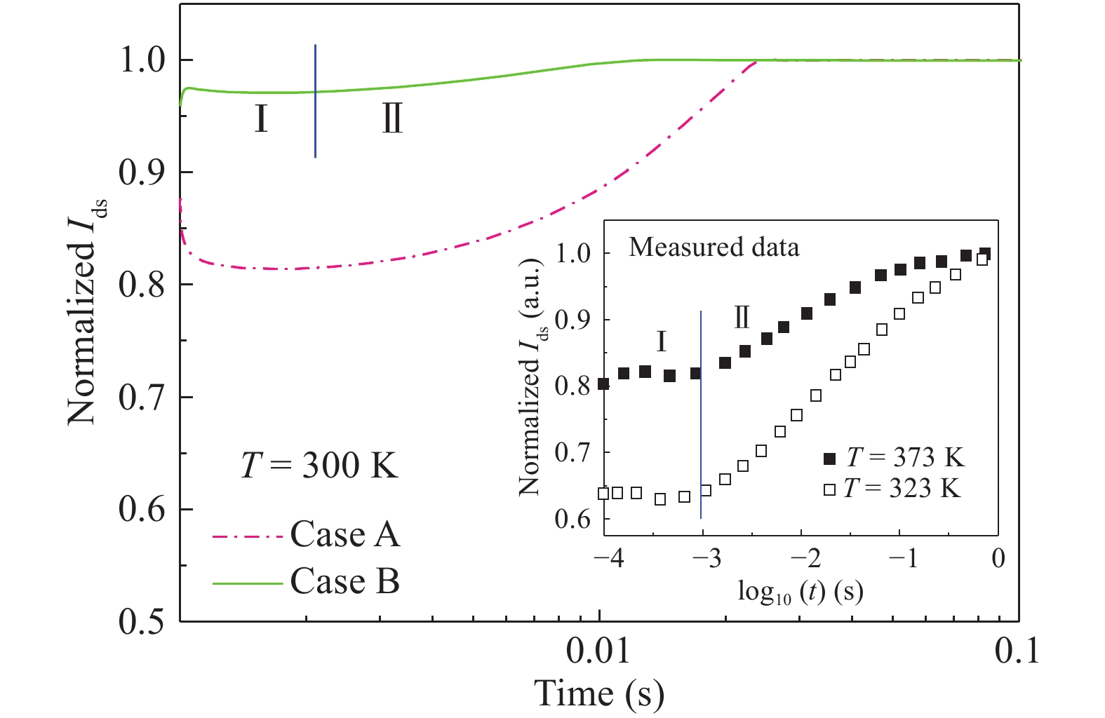 Fig. 3.  (Color online) The normalized transient currents of AlGaN/GaN HEMT (Lg = 90 nm) with different models, where the measured data from Ref. [19] is plotted in the inset.