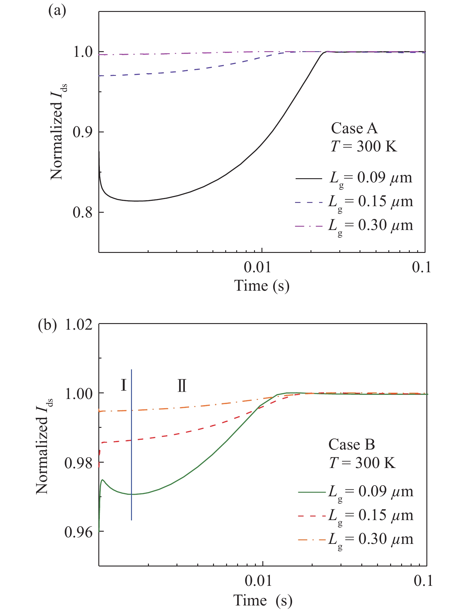 Fig. 4.  (Color online) The normalized transient currents of AlGaN/ GaN HEMTs with various gate lengths. (a) Case A. (b) Case B.