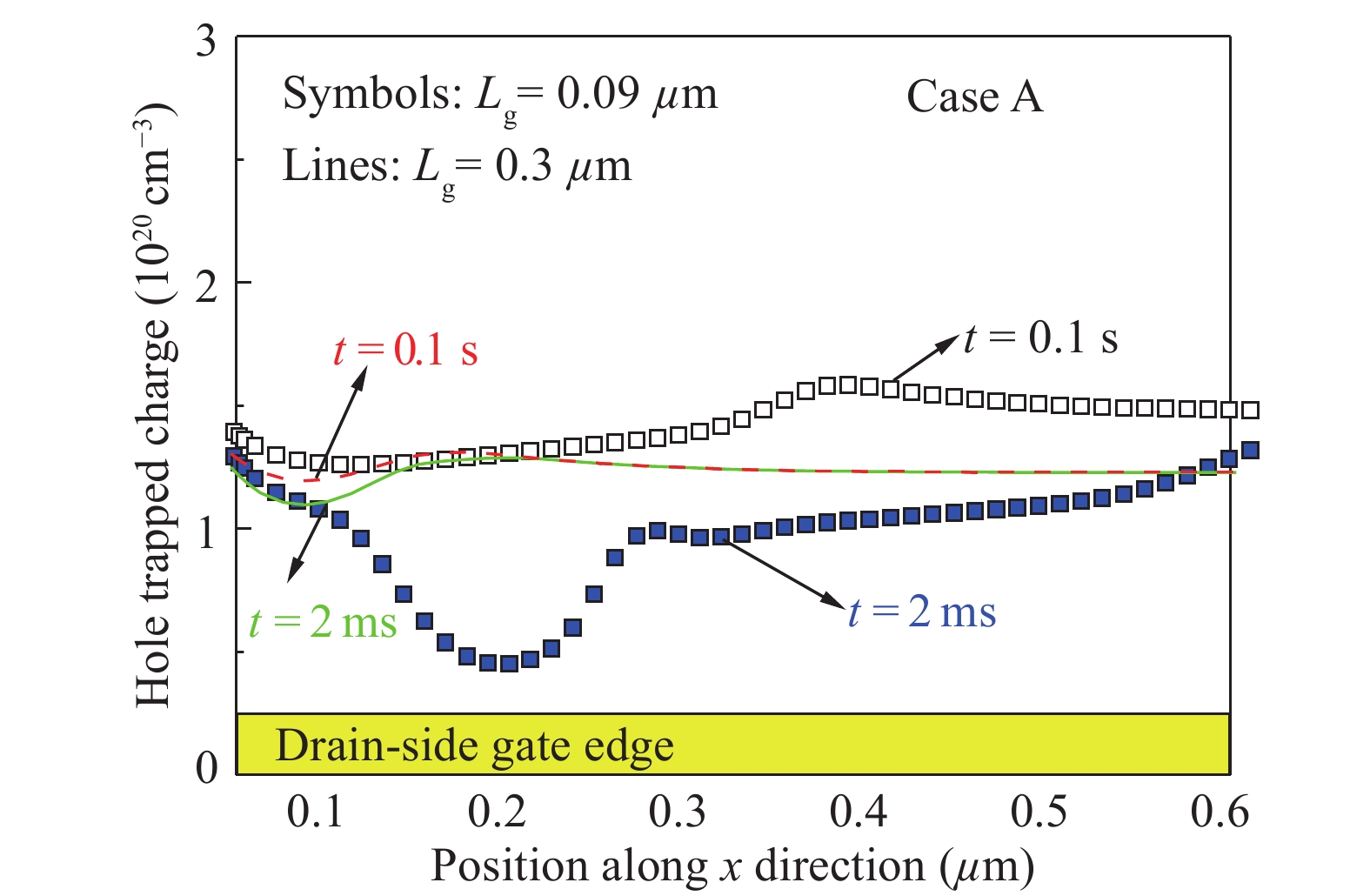 Fig. 5.  (Color online) The dynamic concentration of holes captured by the surface donor traps in AlGaN/GaN HEMTs with different gate lengths.