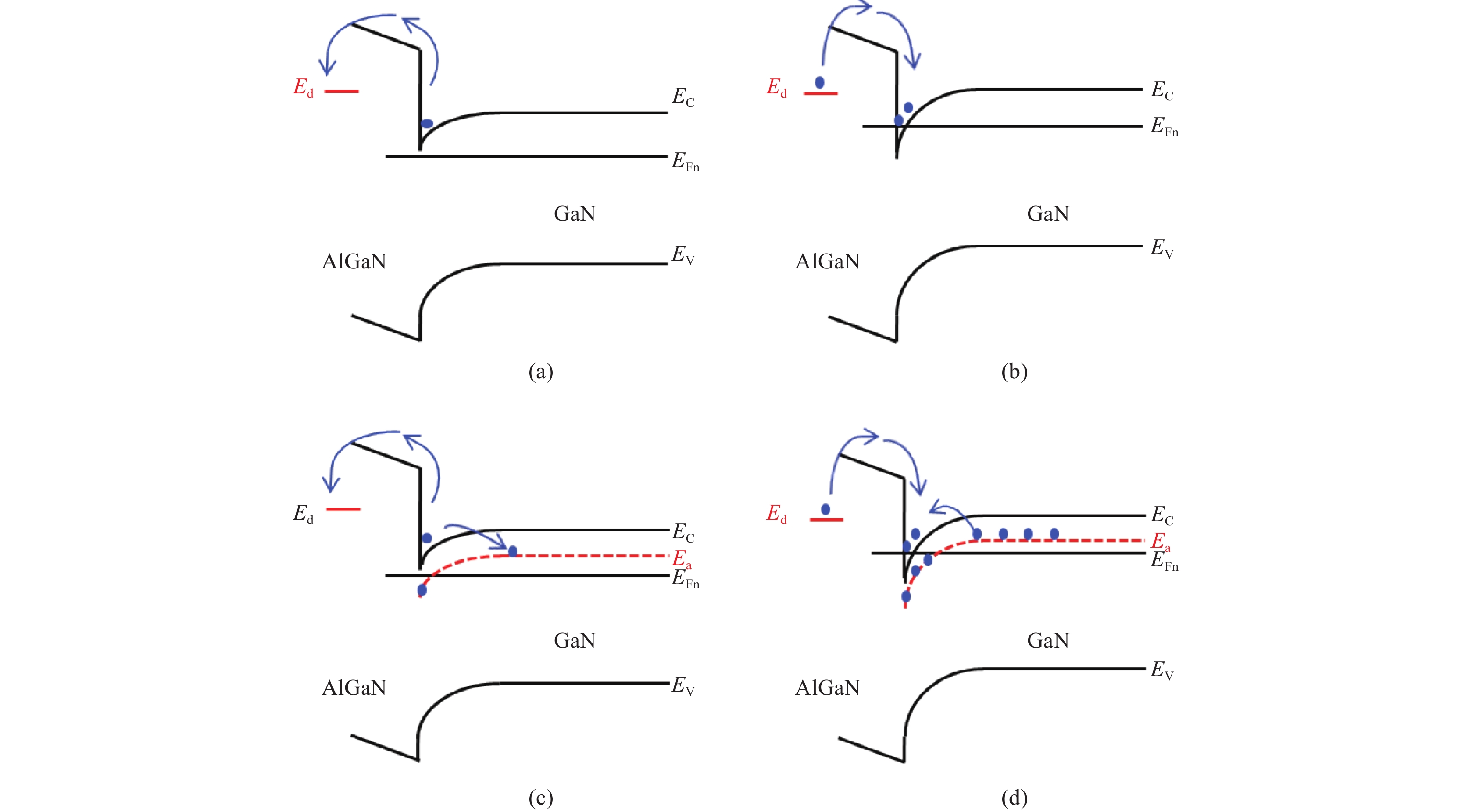 Fig. 7.  (Color online) Schematic band diagram of AlGaN/GaN HEMT with different models: (a) during the trapping process in the pinch-off state and (b) during the detrapping process in the on-state for case A, (c) during the trapping process in the pinch-off state and (d) during the detrapping process in the on-state for case B.