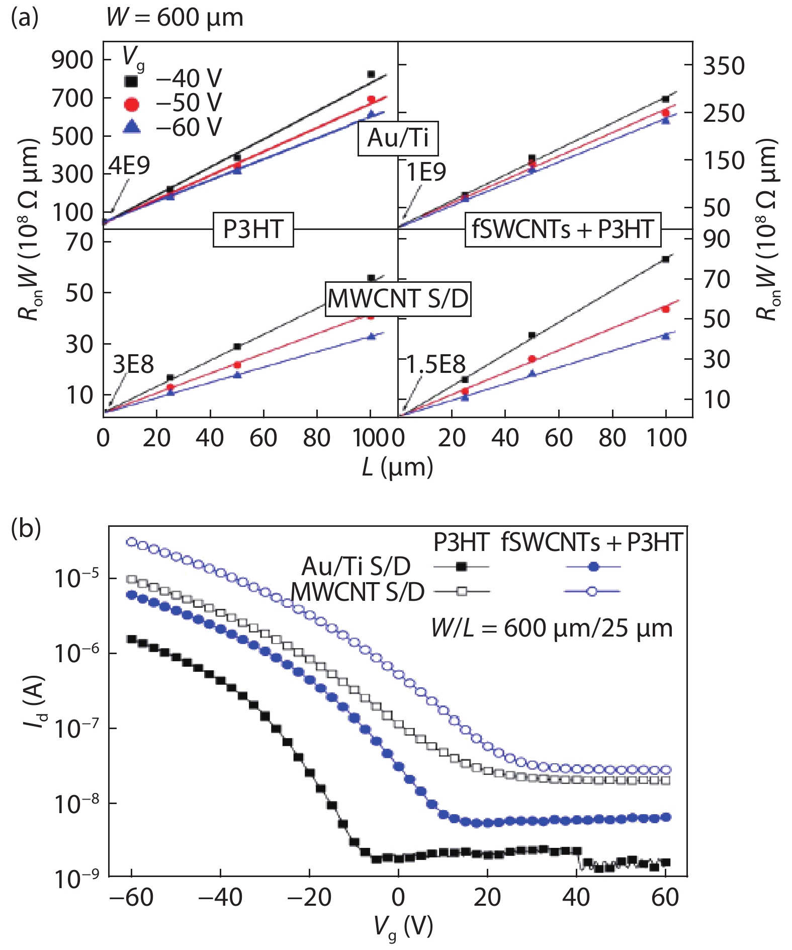Chang C H, Chien C H. Functionalized single-walled carbon-nanotube-blended P3HT-based thin-film transistors with multiwalled carbon-nanotube source and drain electrodes. IEEE Electron Device Lett, 2011, 32(10), 1457 doi: 10.1109/LED.2011.2163054
