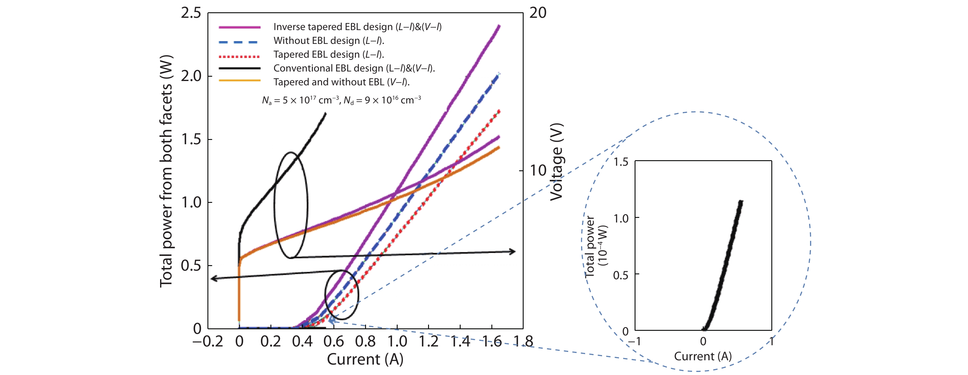 Fig. 4.  (Color online) Showing the (a) LI and (b) VI curve for the two LD structure for the conventional EBL, tapered EBL, without EBL and inverse tapered EBL designs with the NA = 5 × 1020 cm–3, ND = 9 × 1019 cm–3.