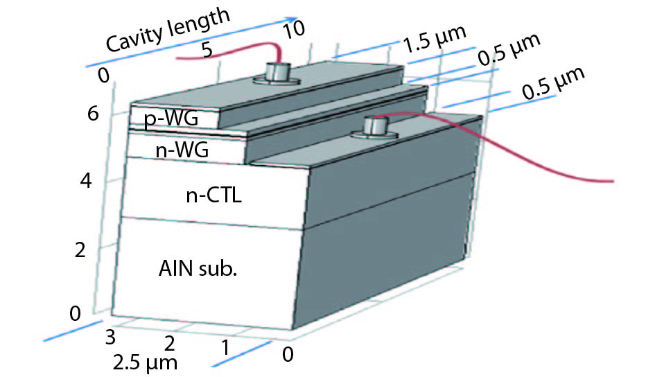 Abstract: In this paper, an ultraviolet C-band laser diode lasing at 277 nm composed of B0.313Ga0.687N/B0.40Ga0.60N QW/QB heterostructure on Mg and Si-doped AlxGa1–xN layers was designed, as well as a lowest reported substitutional accepter and donor concentration up to NA = 5.0 × 1017 cm–3 and ND = 9.0 × 1016 cm–3 for deep ultraviolet lasing was achieved. The structure was assumed to be grown over bulk AlN substrate and operate under a continuous wave at room temperature. Although there is an emphasizing of the suitability for using boron nitride wide band gap in the deep ultraviolet region, there is still a shortage of investigation about the ternary BGaN in aluminum-rich AlGaN alloys. Based on the simulation, an average local gain in quantum wells of 1946 cm–1, the maximum emitted power of 2.4 W, the threshold current of 500 mA, a slope efficiency of 1.91 W/A as well as an average DC resistance for the VI curve of (0.336 Ω) had been observed. Along with an investigation regarding different EBL, designs were included with tapered and inverse tapered structure. Therefore, it had been found a good agreement with the published results for tapered EBL design, with an overweighting for a proposed inverse tapered EBL design.