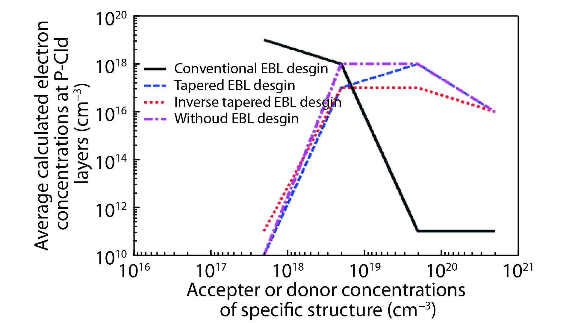 Fig. 5.  (Color online) Showing the relationship between the averages calculated electron concentrations within the P-Cladding layer for different accepter and donor concentrations for the four EBL designs.