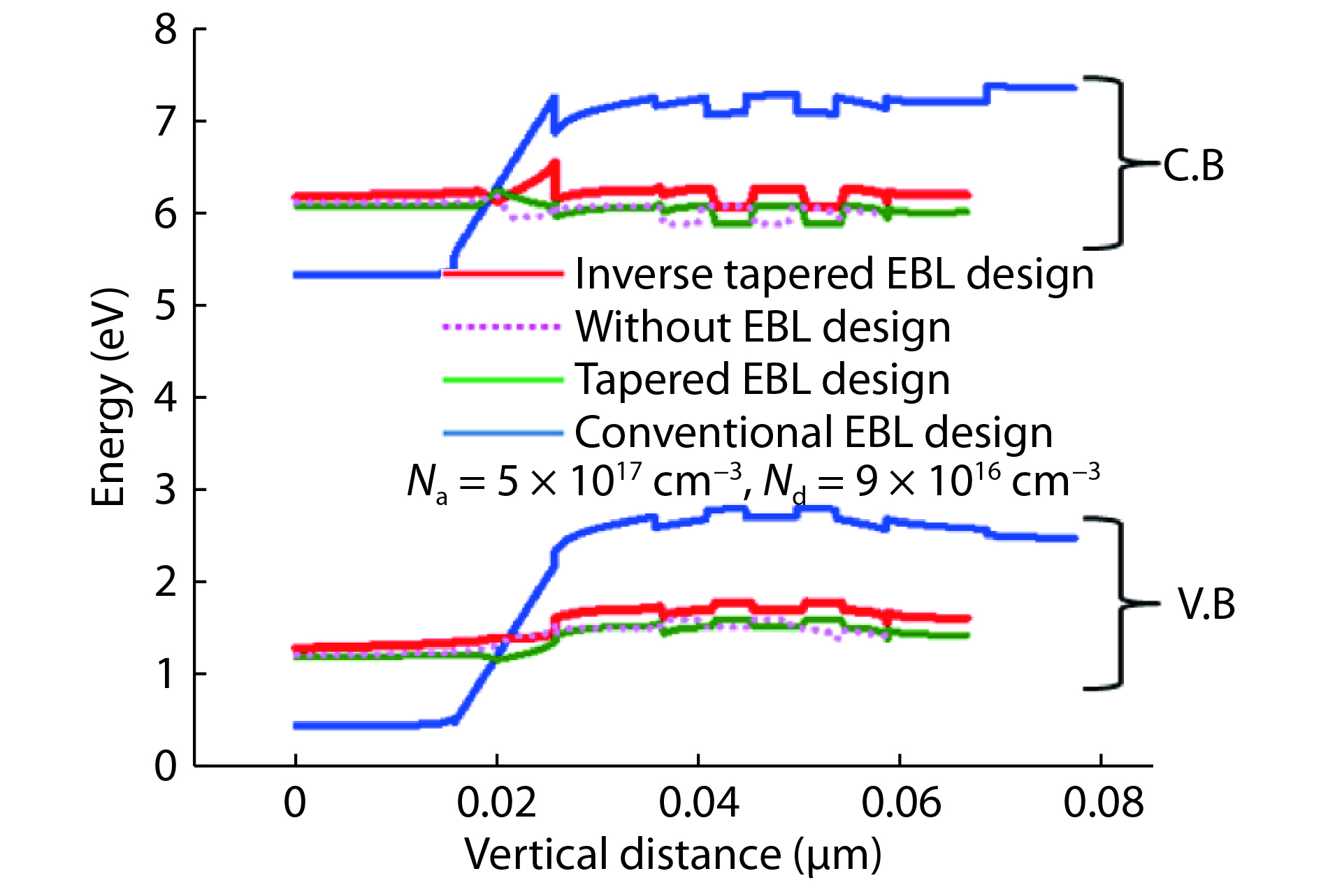 Fig. 6.  (Color online) Vertical cut view for the LD structure that illustrates the band diagram for the active region and EBL layer, with the NA = 5 × 1017 cm–3, ND = 9 × 1016 cm–3 for the four different EBL layers.