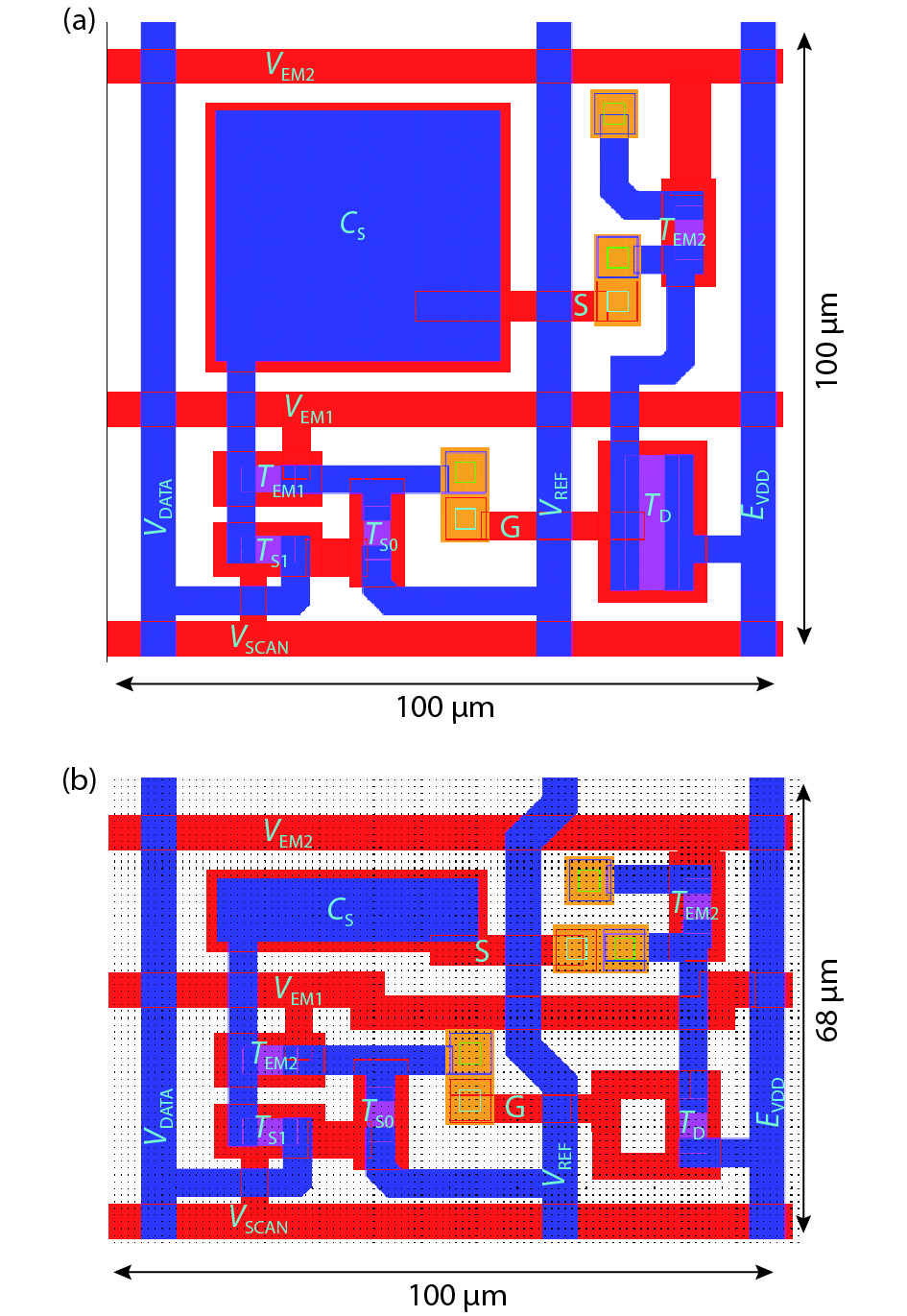Abstract: The suitability of indium gallium zinc oxide (IGZO) thin-film transistors (TFT) for implementation of active matrix display of organic light emitting diodes (AMOLED) compensation pixel circuits is addressed in this paper. In particular, the impact of mobility on compensating performance for the implementation in AMOLED pixel circuits is investigated. Details of the effective mobility modeling using the power law of gate-to-source voltage are provided, and parameters are extracted according to the measured current-to-voltage data of IGZO TFT samples. The investigated AMOLED pixel circuit consists of 4 switching TFTs, 1 driving TFT, and 1 capacitor. A " source-follower” structure is used for the threshold voltage extraction of the driving transistor. A new timing diagram is proposed; thus the current error of the pixel circuit is almost independent of the effective mobility. But, to improve the precision of the threshold voltage extraction of the driving transistor, the mobility is required to be greater than 5 cm2V?1s?1. On the other hand, the optimized storage capacitance is reversely proportional to the effective mobility. Thus, the layout area of the pixel circuit can be decreased from 100 × 100 to 100 × 68 μm2, with the effective mobility increased from 10 to 50 cm2V?1s?1. Therefore, IGZO TFT is a good alternative backplane technology for AMOLED displays, and a higher effective mobility is preferred for high compensation performance and compact layout.