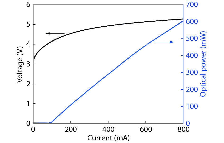 Abstract: GaN-based continuous-wave operated blue-violet laser diodes (LDs) with long lifetime are demonstrated, which are grown on a c-plane GaN substrate by metal organic chemical vapor deposition with a 10 × 600 μm2 ridge waveguide structure. The electrical and optical characteristics of a blue-violet LD are investigated under direct-current injection at room temperature (25 °C). The stimulated emission wavelength and peak optical power of the LD are around 413 nm and over 600 mW, respectively. In addition, the threshold current density and voltage are as small as 1.46 kA/cm2 and 4.1 V, respectively. Moreover, the lifetime is longer than 1000 hours under room-temperature continuous-wave operation.