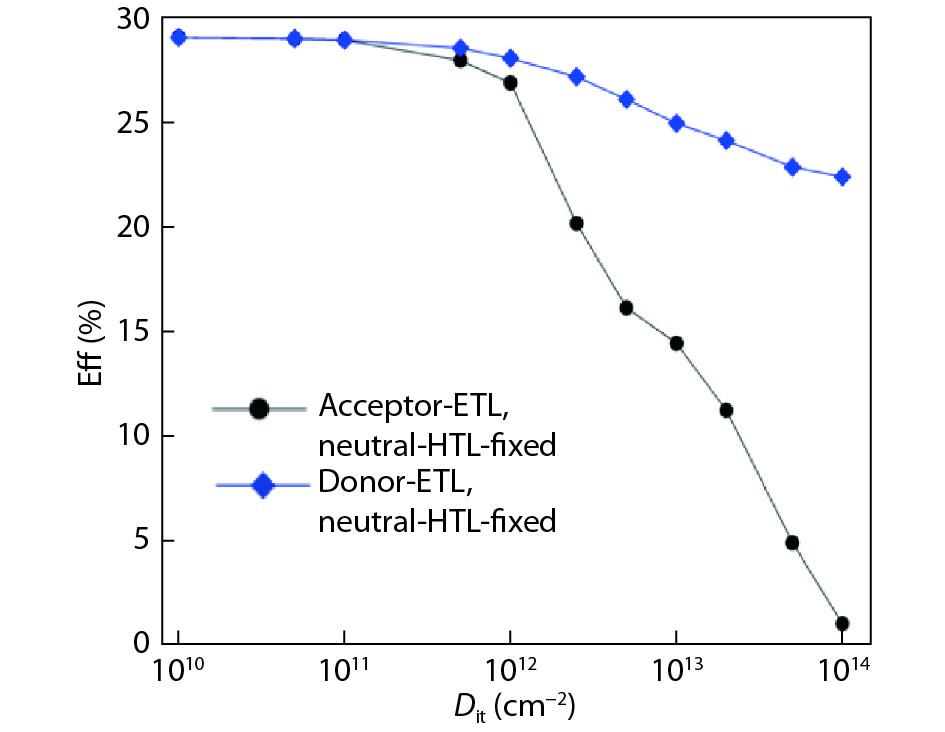 Abstract: Although tin halide perovskite has shown excellent photoelectric performance, its efficiency of solar cell is low compared with that of lead halide. In order to enhance the efficiency of tin halide perovskite solar cell, a deep understanding of the role of the defects in the perovskite absorption layer and at the electron transport layer (ETL)/absorber or absorber/hole transport layer (HTL) interface is very necessary. In this work, the planar heterojunction-based CH3NH3SnI3 perovskite solar cells were simulated with the SCAPS-1D program. Simulation results revealed a great dependence of device efficiency on defect density and interface quality of the perovskite absorber. The defect density at the front interface is critical for high efficiency, and the polarity of the interface charge has a different impact on the device efficiency. Strikingly, an efficiency over 29% was obtained under the moderate simulation conditions.