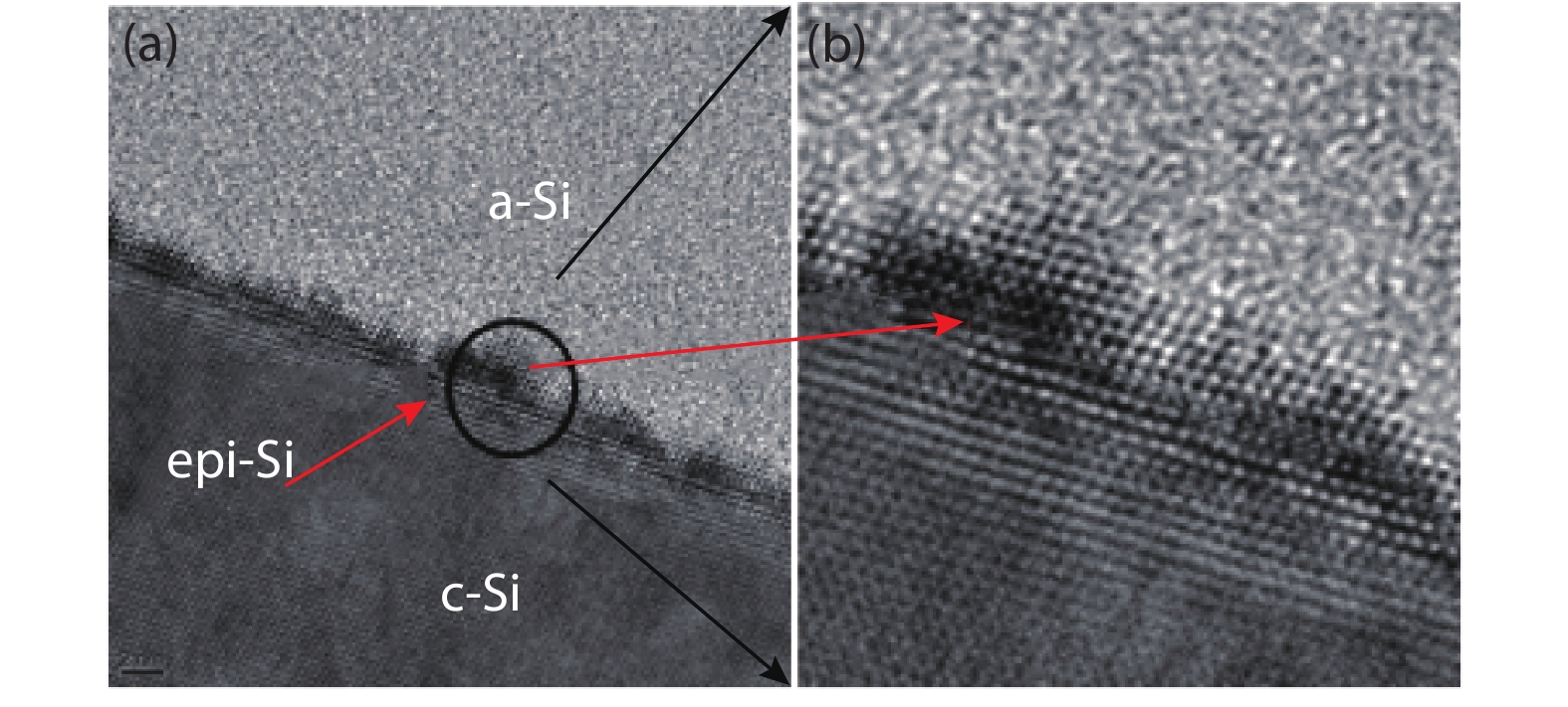 Fig. 10.  (Color online) The transmission electron microscopy (TEM) image at the a-Si:H(i)/c-Si interface of excessively small pyramid.