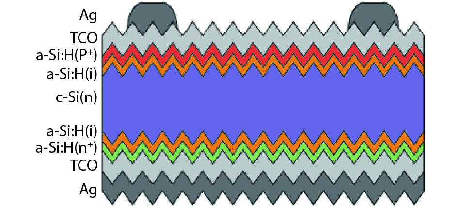 Fig. 2.  (Color online) Schematic cross-section of the silicon heterojunction solar cell structure.