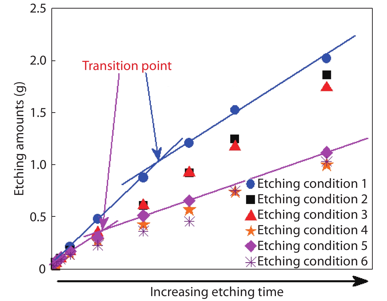 Fig. 6.  (Color online) The relationship between pyramid sizes and etching amounts at the transition.