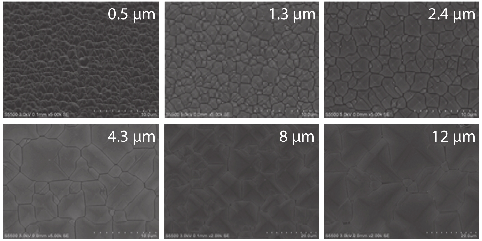 Fig. 8.  Scanning electron microscope (SEM) images of samples with various pyramid sizes.