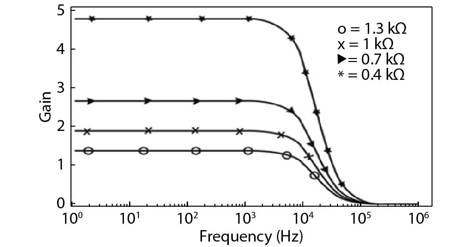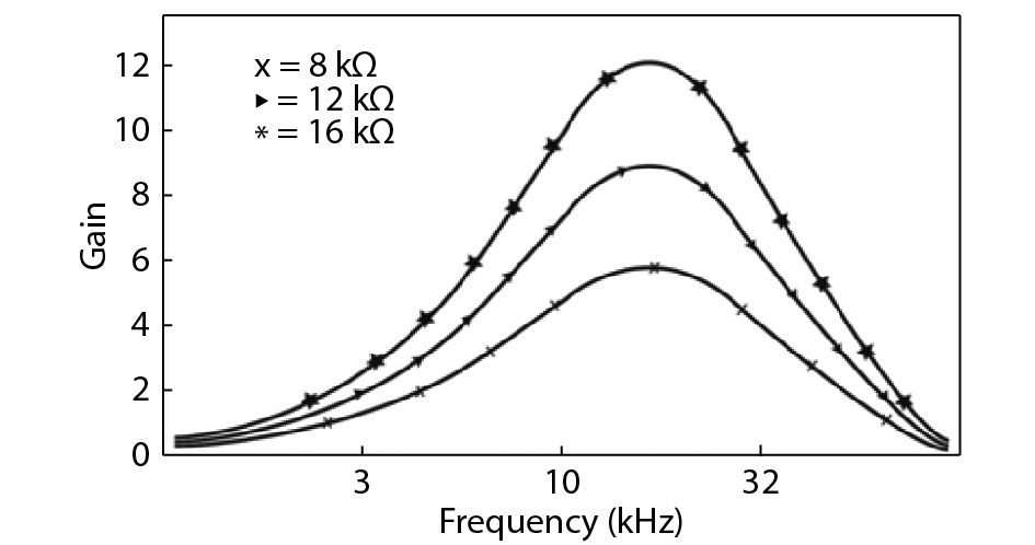 | Component values | R1 = 1.3 kΩ; R2 = 2.5 kΩ (for LPF) and 10 kΩ (for BPF); R3 = 3 kΩ; R4 = 2 kΩ; C1 = 5 nF; C2 = 5 nF |