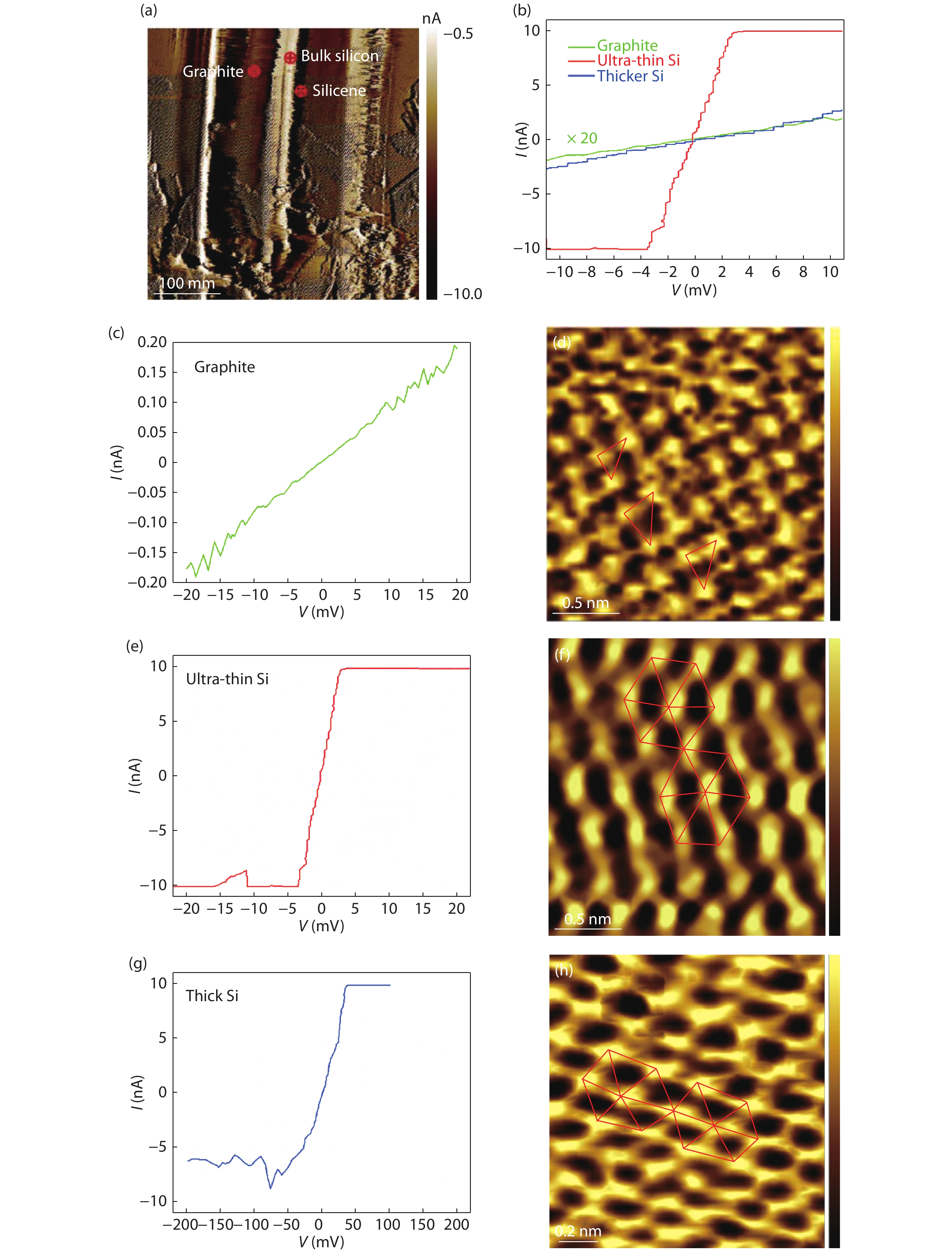 Abstract: We report the growth of Si nanostructures, either as thin films or nanoparticles, on graphene substrates. The Si nanostructures are shown to be single crystalline, air stable and oxidation resistive, as indicated by the observation of a single crystalline Si Raman mode at around 520 cm–1, a STM image of an ordered surface structure under ambient condition, and a Schottky junction with graphite. Ultra-thin silicon regions exhibit silicene-like behavior, including a Raman mode at around 550 cm–1, a triangular lattice structure in STM that has distinctly different lattice spacing from that of either graphene or thicker Si, and metallic conductivity of up to 500 times higher than that of graphite. This work suggests a bottom-up approach to forming a Si nanostructure array on a large-scale patterned graphene substrate that can be used to fabricate nanoscale Si electronic devices.