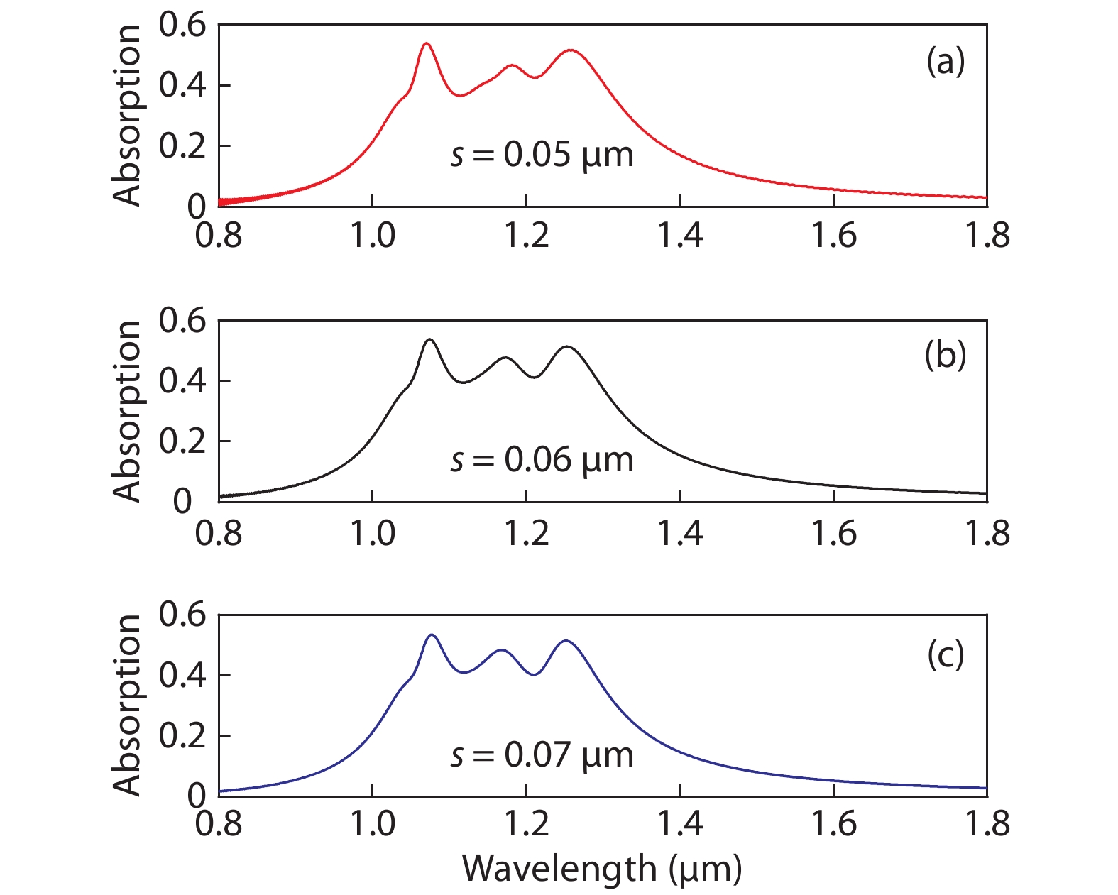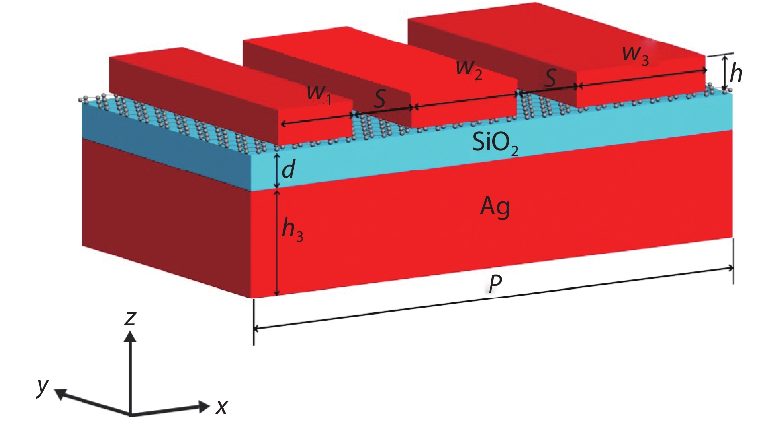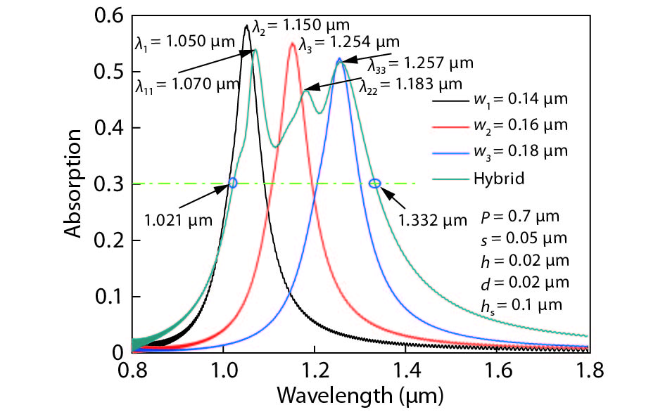 Abstract: As emerging new material, graphene has inspired great research interest. However, most of the studies focused on how to improve the absorption efficiency of graphene, but payed little attention on broadening absorption bandwidth while ensuring high absorption efficiency. In this work, we proposed a hybrid nanostructure, which not only can improve absorption efficiency but also can increase absorption bandwidth. The proposed hybrid nanostructure consists of a monolayer graphene sandwiched between three Ag gratings with different widths and a SiO2 spacer on a Ag substrate, these three gratings and substrate can excite three independent magnetic dipole resonances. In our calculations, we numerically demonstrate the proposed hybrid structure can achieve graphene absorption bandwidth of 0.311 μm in near-infrared region with absorption exceeding 30% . We also studied absorption peaks dependence on gratings widths and SiO2 spacer thickness, and explained the results using physical mechanism. Our research can provide a theoretical guidance for future device preparation.
