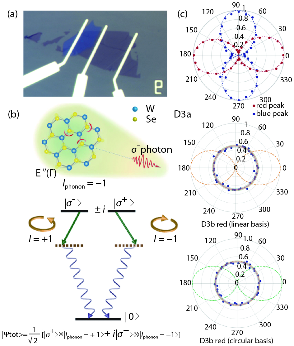 Fig. 1.  Phonon-photon interaction in monolayer WSe2. (a) Optical image of the monolayer WSe2 FET device. (b) Schematic of phonon-photon entanglement. The circularly polarized states (σ–/σ+) with angular momentum of l = –1/+1 are degenerate in WSe2. The σ–(σ+) photon state can only couple with l = +1 (–1) phonon and scatter to σ+(σ–) state due to conservation of angular momentum. The indistinguishability of the two paths leads to phonon-photon entanglement. (c, d) Polarization of QDs and their phonon replicas. D3a doublets are linearly polarized and orthogonal to each other, as expected from a localized neutral exciton. D3b doublets, the phonon replica of D3a, do not show any dependence on collection polarization, indicating that D3b are unpolarized. The lost of polarization information from parent peaks to phonon replicas is a result of phonon–photon entanglement.