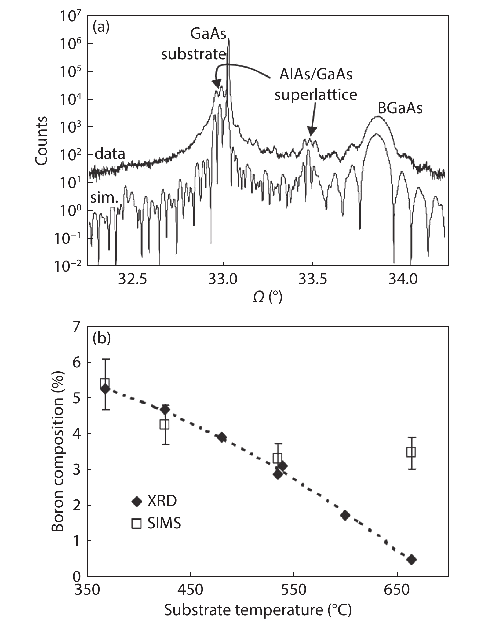 Dumont H, Rutzinger D, Vincent C, et al. Surface segregation of boron in BxGa1? xAs/GaAs epilayers studied by X-ray photoelectron spectroscopy and atomic force microscopy. Appl Phys Lett, 2003, 82, 1830 doi: 10.1063/1.1561164
