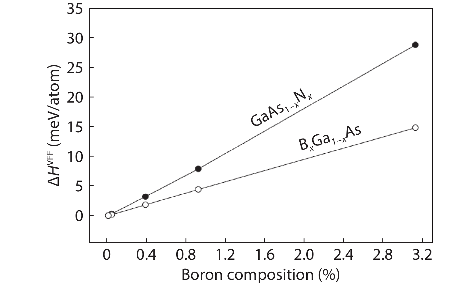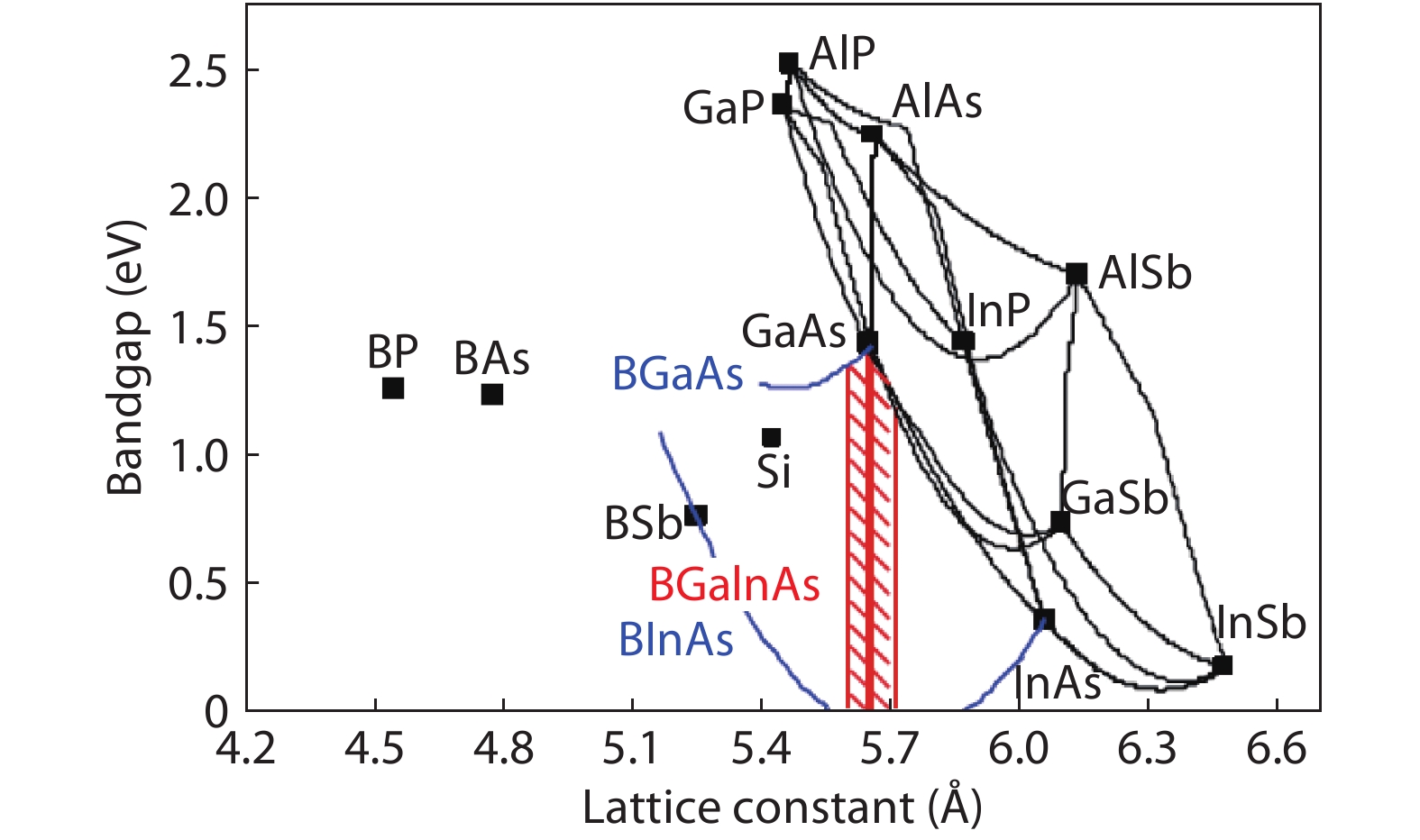 Dumont H, Monteil Y. Some aspects on thermodynamic properties, phase diagram and alloy formation in the ternary system BAs–GaAs—Part II: BGaAs alloy formation. J Cryst Growth, 2006, 290, 419 doi: 10.1016/j.jcrysgro.2005.12.080