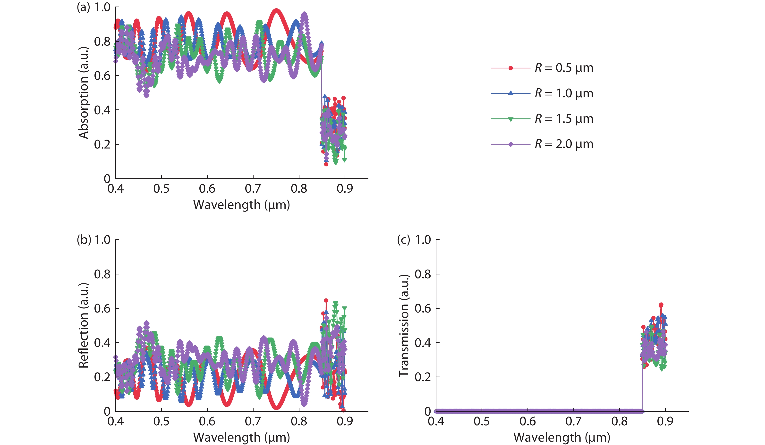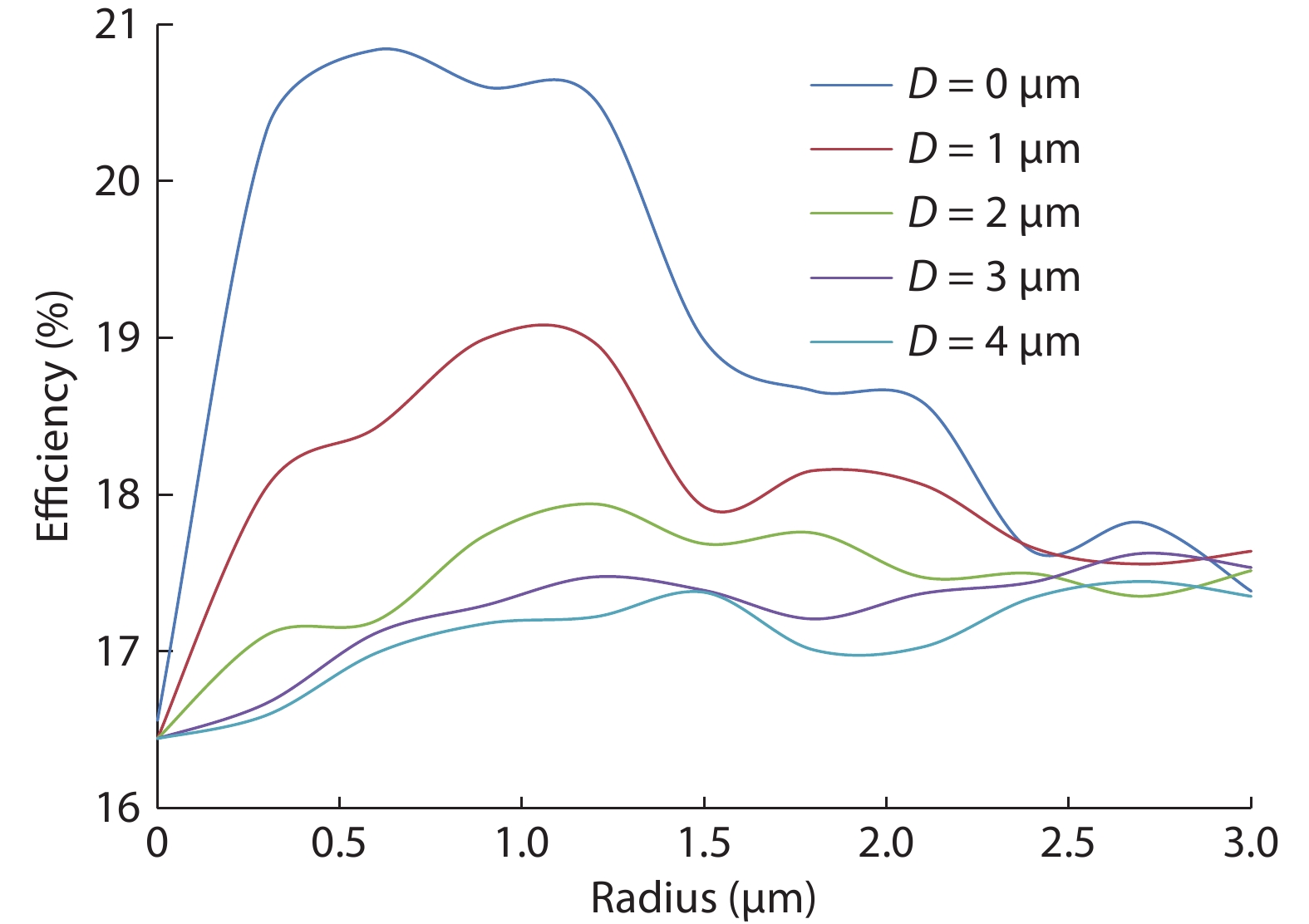 Abstract: In this paper, we present our efforts on simulating and analyzing the effect of two-dimensional nano-sphere surface array on the characteristic of GaAs solar cells. Based on the scattering and diffraction theory of the photonic crystals, the simulation results show that the distance of adjacent nano-spheres (D) has the pronounced influence on the conversion efficiency and exhibits much poor tolerance, the absolutely conversion efficiency is reduced by exceeding of 2% as the D varies from 0 to 1 μm, in addition, the lower conversion efficiency (< 18%) is exhibited and almost remains unaltered when the D is of > 2 μm. The radius (R) of nano-spheres demonstrates much great tolerance. For D = 0, the solar cells exhibit high conversion efficiency (> 20%) and the efficiency is only varied by less than 1% when R is varied in a very wide region of 0.3–1.2 μm. One can also find out that there is good tolerance for efficiency around the optimal value of refractive index and there is only about 0.2% decrease in final cell efficiency for around ±24% variation in the optimal values, which implys that it does not demand high precision processing equipment and the whole nano-sphere array could be fully complemented using self-assembled chemical methods.